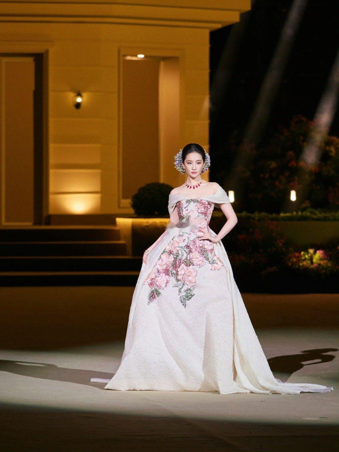礼裙是采用 3000朵真花手工缝制的层叠花瓣设计,整体呈现“移动花园”的视觉效果,符合主题又凸显天仙的排面!