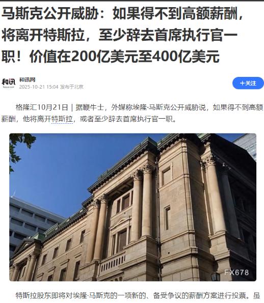 马斯克公开威胁:如果得不到高额薪酬,将离开特斯拉,至少辞去首席执行官一职!价值在200亿美元至400亿美元。 特斯拉从2003年起步,本来就是马斯克一手拉扯大的电动车帝国。早年间他砸钱砸时间,带队搞出Model S和Model 3这些爆款,股价从谷底窜到天上,公司市值一度破万亿刀。 但现在马斯克却公开威胁,如果拿不到200亿至400亿美元的高额薪酬,他就要撂挑子不干了。 马斯克为啥敢这么豪横?因为特斯拉的今天确实离不开他。2008年金融危机最严重的时候,马斯克自己掏腰包给特斯拉发工资,差点把家底都赔光。他带着团队没日没夜地研发,硬是把Model S做成了高端电动车的标杆。 后来Model 3上市,马斯克在工厂里吃住了三个月,亲自盯着生产线解决各种难题,才让这款车成为全球销量冠军。可以说,没有马斯克,就没有特斯拉的今天。 但现在马斯克觉得自己的付出和回报不成正比。他提出的新薪酬方案是和公司业绩挂钩的,如果特斯拉市值能涨到8.5万亿美元,利润达到4000亿美元,还要卖出2000万辆车、100万台机器人,再加上Robotaxi和FSD自动驾驶业务大获成功,他才能拿到1万亿美元的股票奖励。 听起来目标挺高,但马斯克觉得这是他应得的。他在社交媒体上直言,如果拿不到这笔钱,他可能就不在特斯拉干了,甚至会去外面搞新项目。 这可把特斯拉的股东们难住了,支持马斯克吧,这1万亿美元的薪酬实在是太高了,相当于特斯拉过去十年利润的总和。反对吧,又怕马斯克真的离开,导致股价暴跌。要知道,2024年马斯克因为和特朗普政府闹矛盾,特斯拉股价就跌了33%,市值蒸发了几千亿美元。如果他真的辞职,后果不堪设想。 其实这已经不是马斯克第一次因为薪酬问题和股东闹别扭了,2018年特斯拉就通过了一个560亿美元的薪酬方案,但被法院以“薪酬过高、董事会被马斯克控制”为由给否了。 这次新方案虽然做了一些调整,但争议还是很大。挪威主权财富基金、加州教师退休基金这些大股东都反对,觉得马斯克的薪酬和公司风险不匹配。但散户股东们却很支持,毕竟特斯拉股价涨了这么多,他们也跟着赚了不少钱。 除了薪酬问题,马斯克的精力分散也是股东们担心的。他现在同时管着特斯拉、SpaceX、X、xAI等好几家公司,还时不时掺和一下美国政治。2025年他在特朗普政府干了几个月,结果特斯拉的业绩就下滑了,Model Y的销量也被比亚迪反超。股东们觉得,马斯克如果不能把全部心思放在特斯拉上,公司的未来堪忧。 特斯拉董事会现在也是骑虎难下,他们一方面要安抚股东,另一方面又得留住马斯克。董事会主席德诺姆说,马斯克是特斯拉的“灵魂人物”,没有他,公司的自动驾驶和机器人项目可能就搞不下去了。所以他们才会提出这个1万亿美元的薪酬方案,希望能把马斯克绑在特斯拉这艘船上。 不过,就算股东们通过了这个方案,马斯克也不一定能拿到钱。因为那些目标实在是太难实现了。特斯拉现在市值才1万多亿美元,要涨到8.5万亿美元,相当于再翻8倍,这在汽车行业几乎是不可能的。而且比亚迪、大众这些竞争对手也在拼命追赶,特斯拉的市场份额一直在下滑。要是马斯克拿不到钱,他真的会离开吗? 马斯克的威胁已经对特斯拉产生了影响,最近特斯拉的股价一直在波动,投资者们都在观望11月6日的股东大会。如果薪酬方案通过,股价可能会涨一波;如果不通过,股价大概率会暴跌。 更麻烦的是,马斯克的高管团队也开始人心惶惶。特斯拉全球制造掌门人朱晓彤这几年已经套现了850万美元,还握着价值2000万美元的股票,谁也不知道他会不会跟着马斯克一起走。 不管这次薪酬风波怎么收场,特斯拉都已经站在了十字路口。如果马斯克留下来,他得证明自己能同时管好几家公司,还能带领特斯拉实现那些疯狂的目标。如果他真的离开,特斯拉就得赶紧找接班人,重新调整战略。 但不管怎样,马斯克已经在特斯拉的历史上留下了浓墨重彩的一笔,他的一举一动都牵动着整个电动车行业的神经。这场薪酬大战,可能会成为特斯拉发展史上的一个重要转折点。 来源:和讯网 【马斯克公开威胁:如果得不到高额薪酬,将离开特斯拉,至少辞去首席执行官一职!价值在200亿美元至400亿美元】