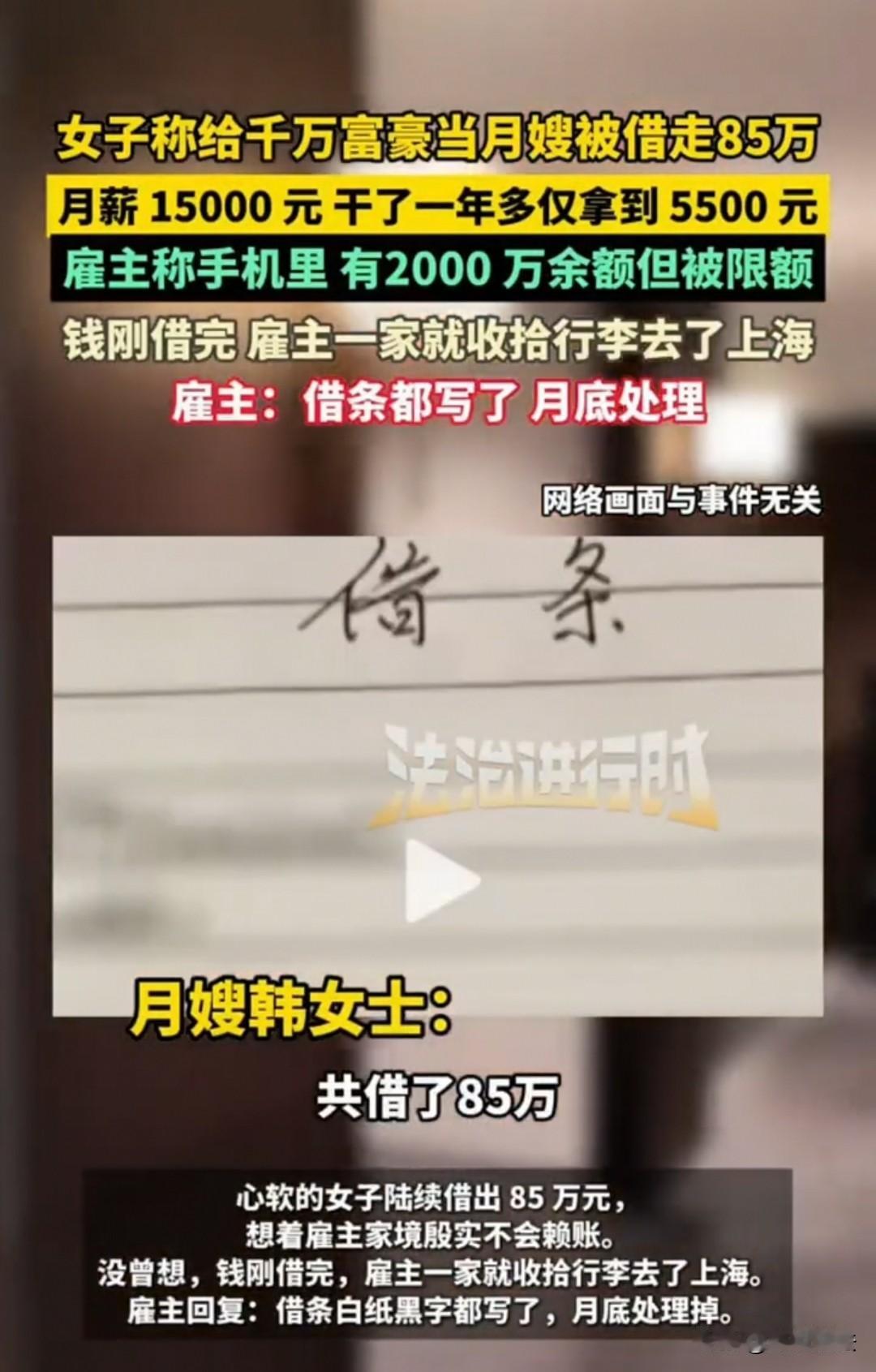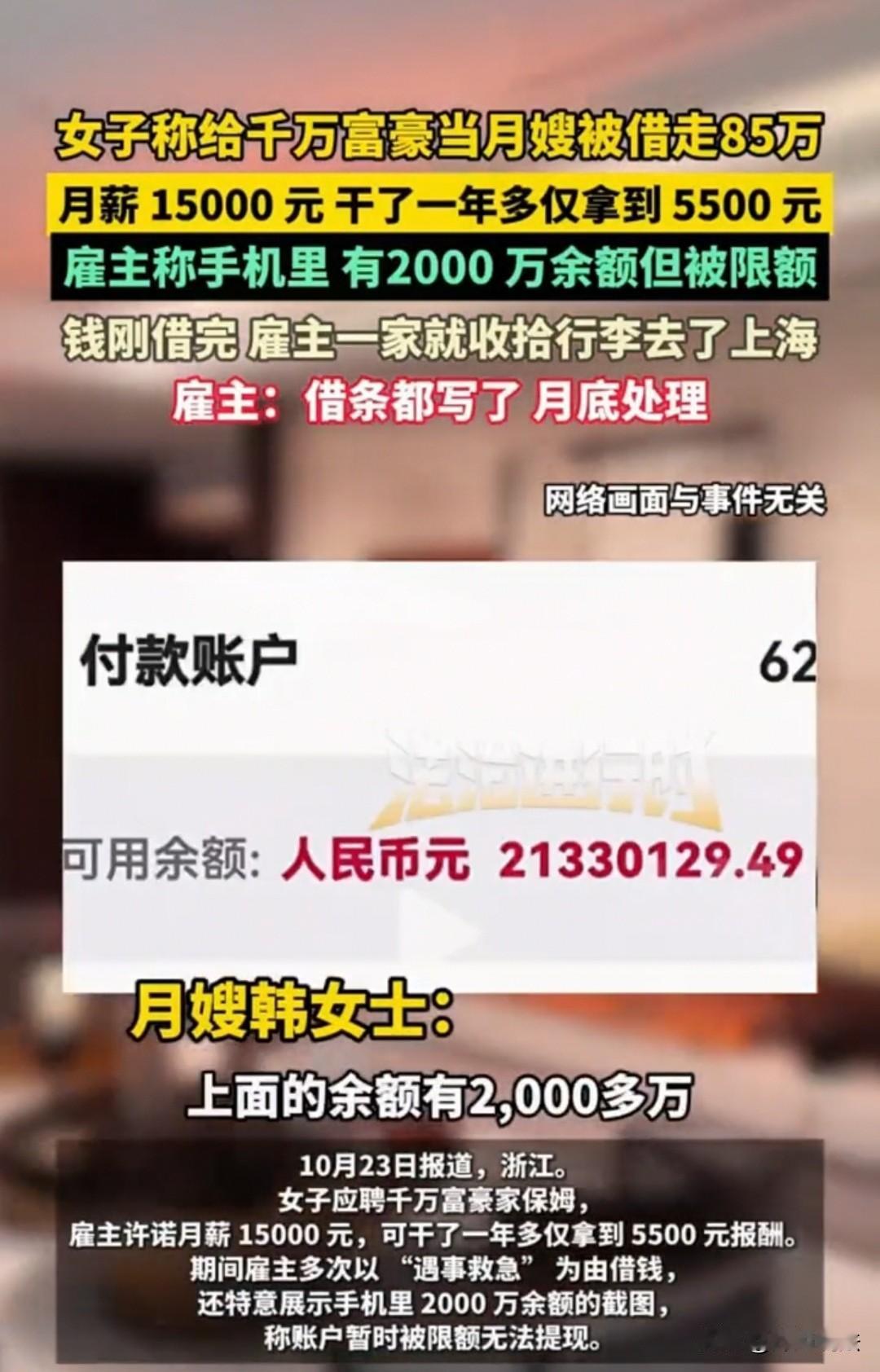 浙江,知名月嫂被外地雇主以1.5万元/月高薪雇佣,刚到雇主家就拿到5500元。次月,雇主奶奶哭穷求助,说自己男友在上海买车买房被查,自己卡里有2000多万却被限额取不出钱。韩女士看雇主家境不错,又怕丢高薪,便陆续借了85万元给对方。干满一年,韩女士只拿到最初的5500元,还发现雇主一家数月前赴沪后没回来,这才醒悟报警。 据鹤城晚报10月24日报道,韩女士家住郑州,一直从事月嫂工作,在当地小有名气。正因她耐心细心、为人善良,找她的雇主特别多。 这样一位称职的月嫂,被浙江一位自称“富豪”的雇主慕名找到,对方提出以每月一万五千元的高薪雇佣韩女士。 韩女士虽是知名月嫂,但在当地的月薪最高也就一万元,并未达到一万五;这明摆着每月能多挣五千元,一年下来就能多挣五万元,换谁都会心动。 就这样,韩女士告别家人,收拾好行囊,跟着这位富豪雇主来到了浙江。有人问,韩女士为何愿意远赴浙江?难道舍得离开家人吗? 其实月嫂这行,不管在当地还是外地,大多都住在雇主家;再说能多挣钱,谁不愿意去?趁年轻把钱挣到手,在她看来才是正事。 话说韩女士刚到雇主家,就见家里装修得十分豪华;雇主也格外爽快,直接转给了她五千五百元。 韩女士心里特别高兴,暗自想着遇到了大方的雇主,以后一定要好好干,不能丢了这份好工作。 到了6月初,也就是韩女士上工的第二个月,本该发薪的时候,雇主的奶奶却突然慌慌张张从卧室跑出来,一把攥住韩女士的手,泪流满面地说:我那操心的男朋友啊,刚在上海买了车、买了房,就因为花销太大,被派出所调查了。 韩女士一听雇主家出了大事,心里顿时犯起嘀咕:这会不会影响自己以后的薪水?不等她想明白,雇主的奶奶又点开自己的手机银行给她看,说:你瞧瞧,你瞧瞧,我卡里不是没钱,上面有两百一十一万多呢,可账户被限额了,钱转不出去,这可怎么办啊? 韩女士一看对方真有这么多钱,悬着的心落了地:既然家境这么殷实,自己的薪水肯定有着落,只要帮他们度过难关,以后就不愁拿不到钱。 这时,雇主的奶奶又拉着她的手说:小韩啊,你能不能先借点钱给我,帮我们把这个危机渡过去?你放心,我不是缺钱,就是钱暂时转不出来。 韩女士心里也有自己的小算盘:要是不借,对方肯定会对自己不满,到时候辞退自己就是分分钟的事。 在月嫂这行,谁要是遇到这么一份高薪工作,不跟宝贝似的攥在手里?于是,她就把自己的积蓄借给了雇主的奶奶,还特意叮嘱对方一定要还,因为这些钱都是自己的血汗钱。 雇主的奶奶立马笑容满面,拉着她说:你就是我的亲闺女啊!以后咱们有福同享、有难同当,绝不会少你一分钱。韩女士听了这话,心里也美滋滋的:自己就是个普通人,对方可是大老板、大富豪,说不定以后还能跟着沾光。 可到了8月,对方又找借口说要交保证金,韩女士这时已经没什么积蓄了。对方见状,又让她帮忙借网贷,还安抚她说:你别怕,我钱虽然取不出来,但家里有路虎车,到时候把车卖了,多的钱都还给你。 就这样到了10月,韩女士前前后后又借出去十几万。这期间,她也痛苦过、挣扎过,但转念一想:之前借出去的钱还没要回来,要是现在不借,对方翻了脸,之前的钱就彻底打水漂了。 再加上对方发过一张五十万元的转账截图,说不是不还钱,只是卡里的钱暂时转不出,等能转了分分钟就打过来。 直到今年6月2日,雇主一家人收拾行李,说要去上海处理事情,让韩女士先在家等着。可这一去,雇主就再也没回来。韩女士这时才想起查那张五十万元的转账截图,发现钱根本就没到账。 她赶紧把之前借给雇主的钱一笔笔算下来,才发现前前后后已经借出去八十五万元——这些钱不全是她自己的,还有不少是向亲朋好友借来的。 之后的日子,韩女士左等右等,既等不到雇主回来,也联系不上对方,电话更是打不通。她这才彻底清醒:自己这是掉进了对方设的圈套。 整整干了一年,被对方借走八十五万,可自己真正拿到手的工资,只有刚到雇主家时给的那五千五百元。 醒悟过来的韩女士赶紧报了警。面对警方,对方却说:我不是不还你钱,先还你一万元,剩下的八十四万元我给你打欠条。 可韩女士哪还敢相信?这一年来,对方以各种借口借钱,嘴上说着自己有钱,却始终没还过一分。 其实,该事件可依《刑法》266条认定诈骗:雇主虚构奶奶男友被查、2000多万账户限额等事实,借高薪工作诱骗韩女士借款85万,后逃匿失联,显见非法占有目的 。 即便写了借条,若能证明借条是掩盖诈骗的手段,无真实还款意愿,仍可定诈骗 。 若不认定诈骗,可依《民法典》538条起诉,申请撤销其恶意转移财产行为,通过财产保全与强制执行追回钱款 。 对于此事,大家如何看?