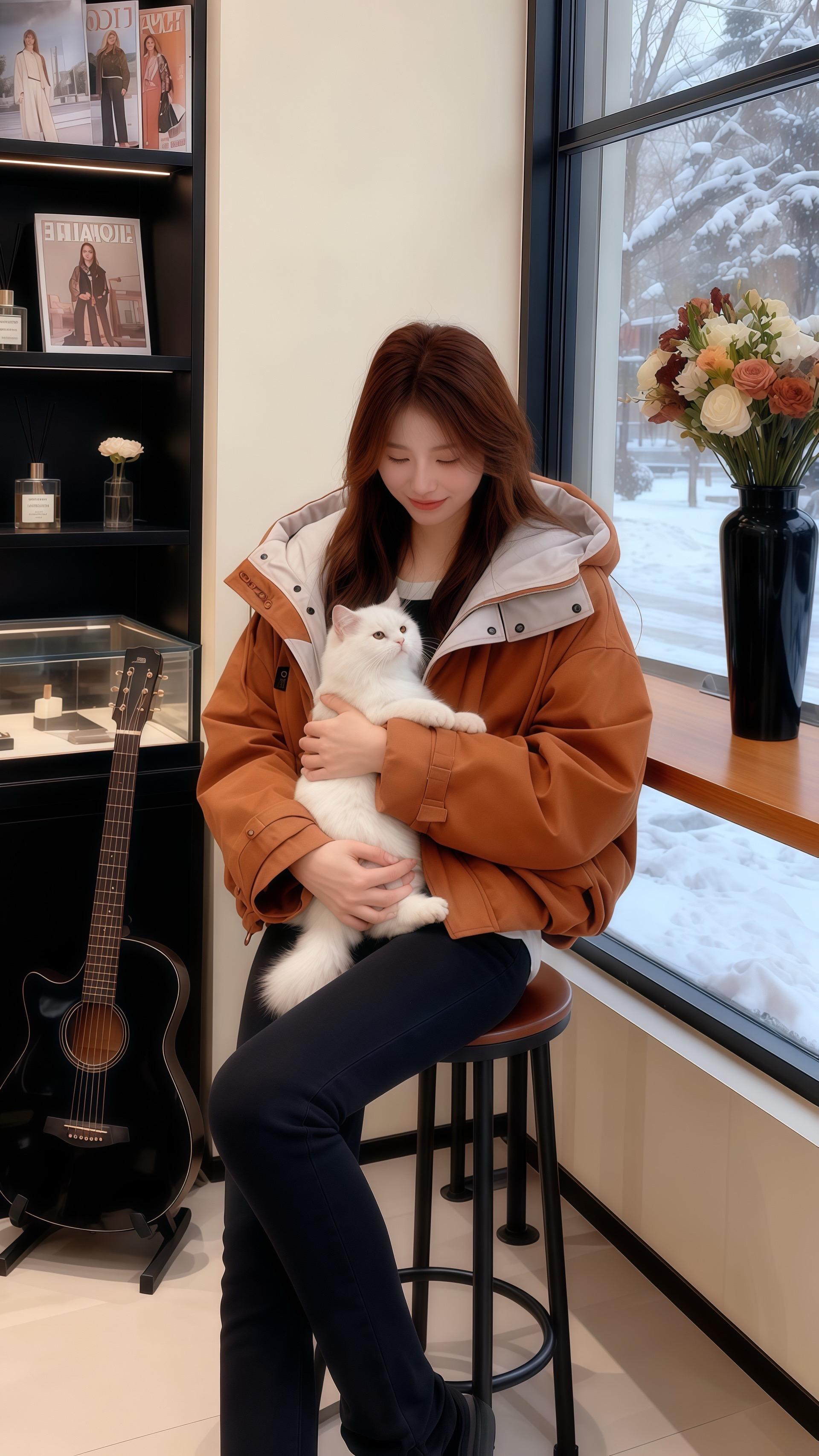走进暖烘烘的咖啡馆,怀里的白猫蹭着她的焦糖色外套,她才发现这穿搭竟如此治愈——廓形外套衬得她灵动又温暖,搭配紧身裤与靴子,在文艺角落自成风景。