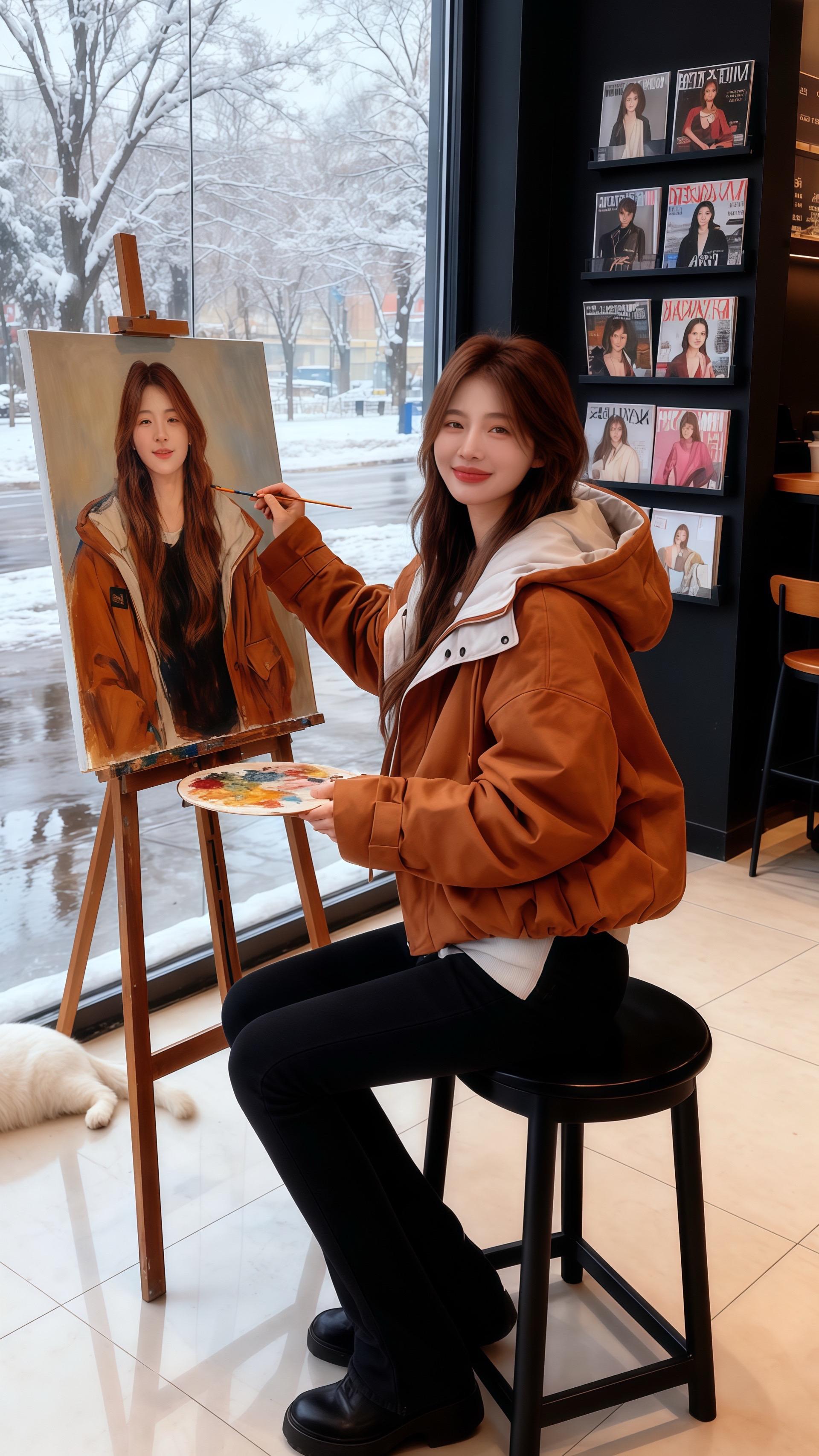 后来她突发奇想,穿着这身行头画自画像。画笔落下,焦糖色在画布上晕染,窗外雪景作衬,她成了画里走出的冬日女主。
