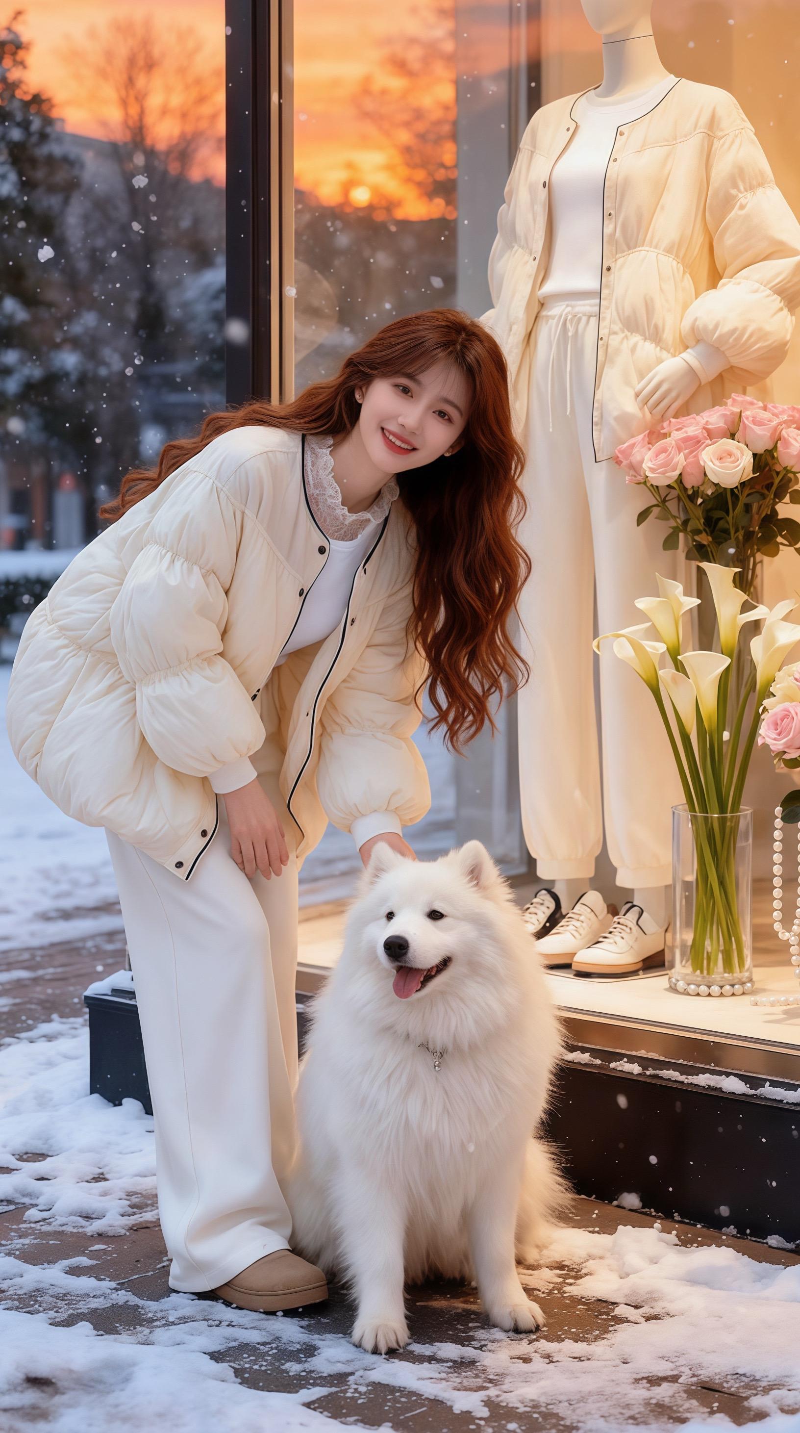 后来,她牵着萨摩耶再来时,换上了同系列的束脚裤款,温柔又随性。狗狗的白毛与她的穿搭相得益彰,路过的摄影