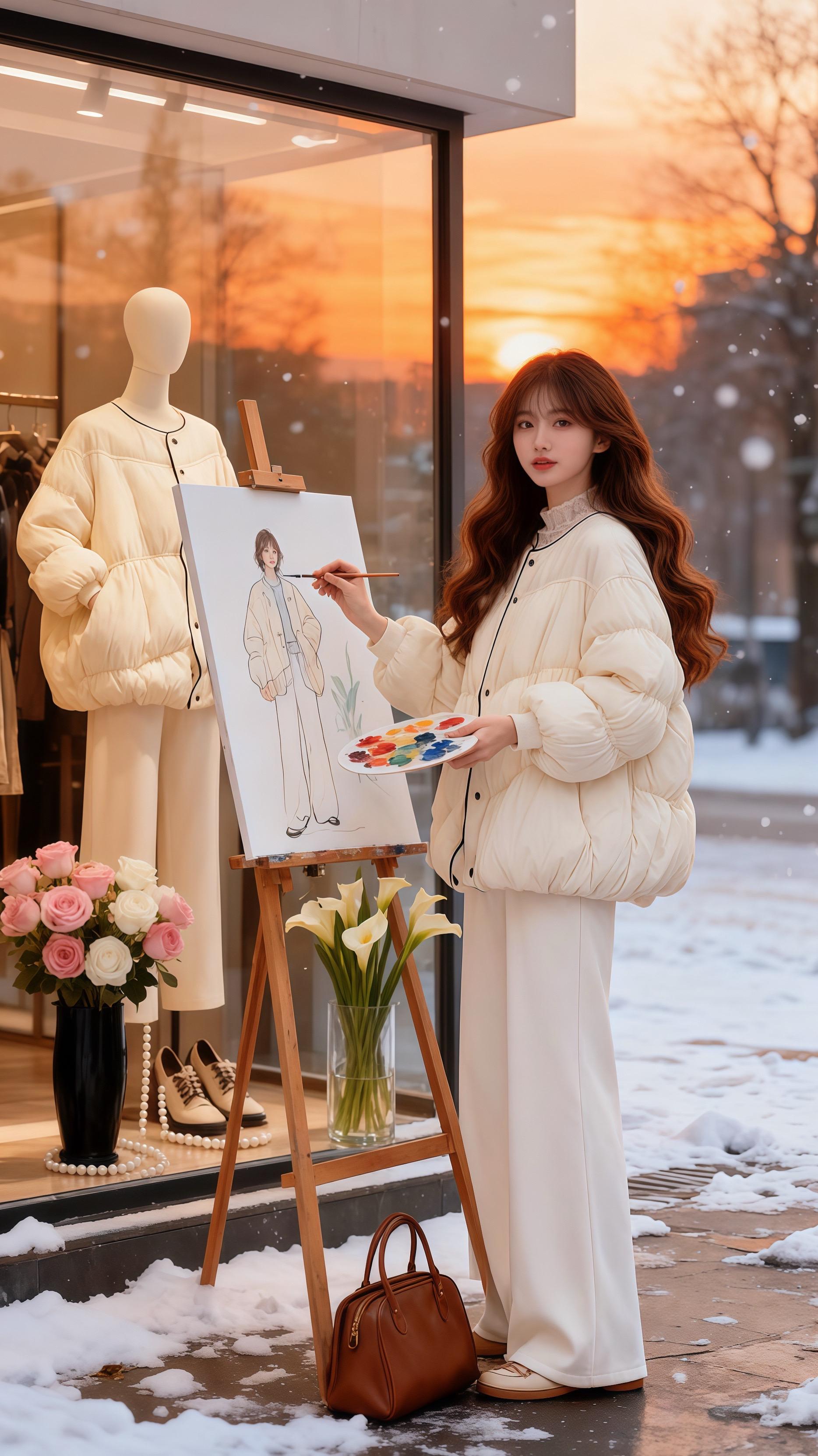 第二天,她带着画架再来,画笔在纸上跳跃,将这身穿搭的灵动一一描摹。暖棕的包包与脚下的鞋子呼应,在雪景里格外吸睛,路过的人都忍不住多看两眼。