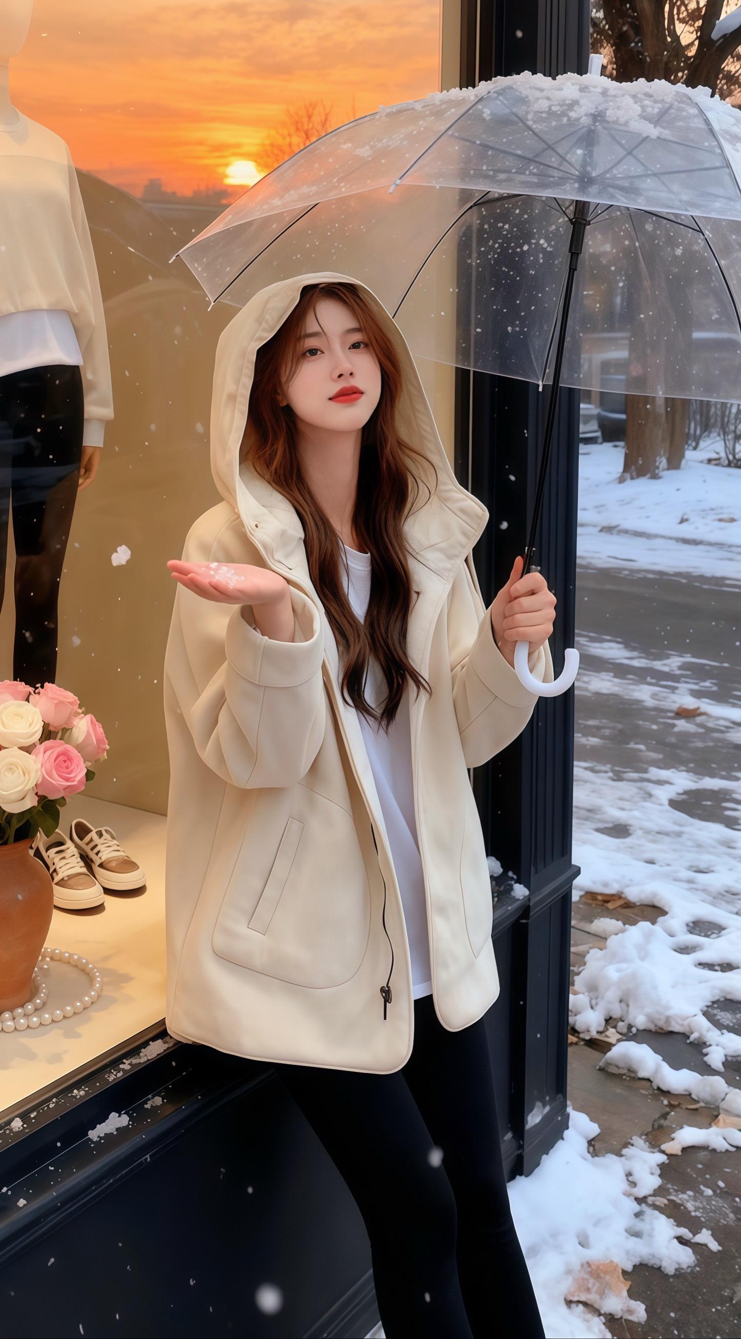 初雪落满街角时,林晚穿着那件奶白色连帽外套出现在橱窗旁。同色系的穿搭在暖橘晚霞里,像一颗裹了糖霜的软糖。