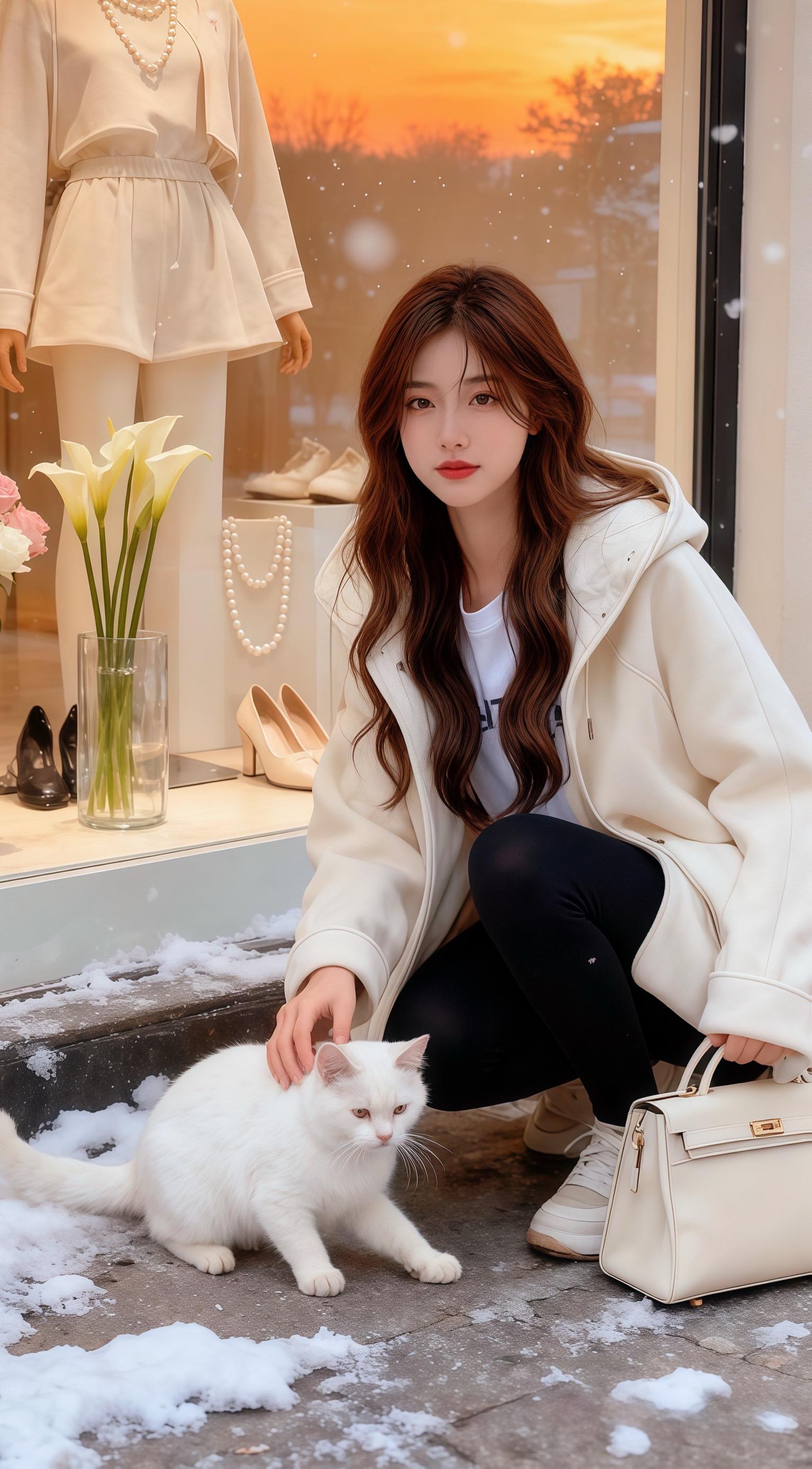 她蹲下身揉着小白猫的脑袋,米白手袋与雪地相映,“奶系穿搭”的温柔感快要溢出屏幕。转瞬间,她撑着透明伞接住雪花,帽檐下的笑眼弯弯,把冬日的清冷都捂成了甜。