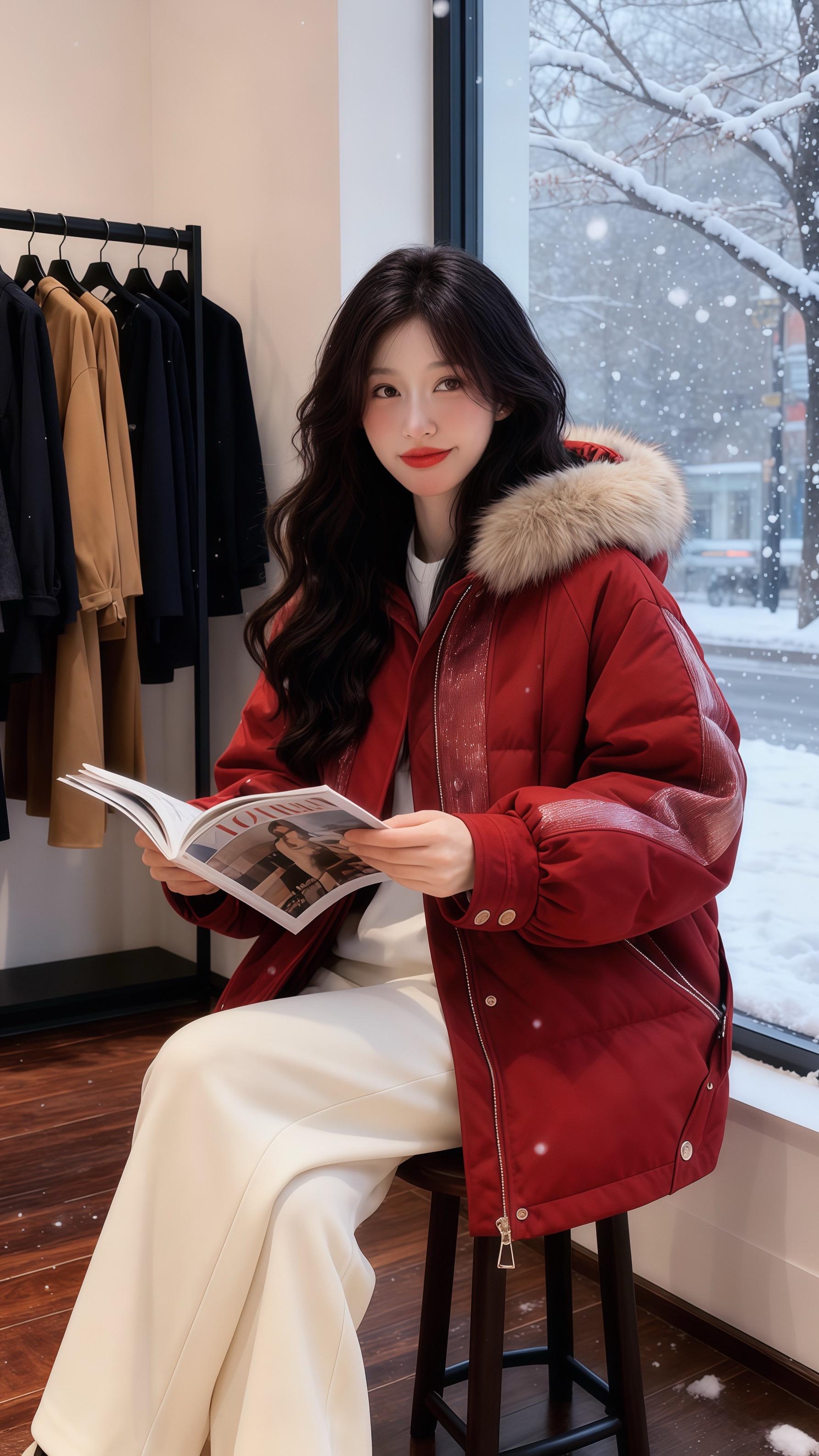 她在画室里对着自己的肖像画调色,红大衣上的亮片随动作闪着细碎的光;坐在服饰店的凳子上翻时尚杂志时,大衣的毛领衬得她气色绝佳;就连在雪天街头望着同款成衣的瞬间,都成了路人眼中的“穿搭模板”。