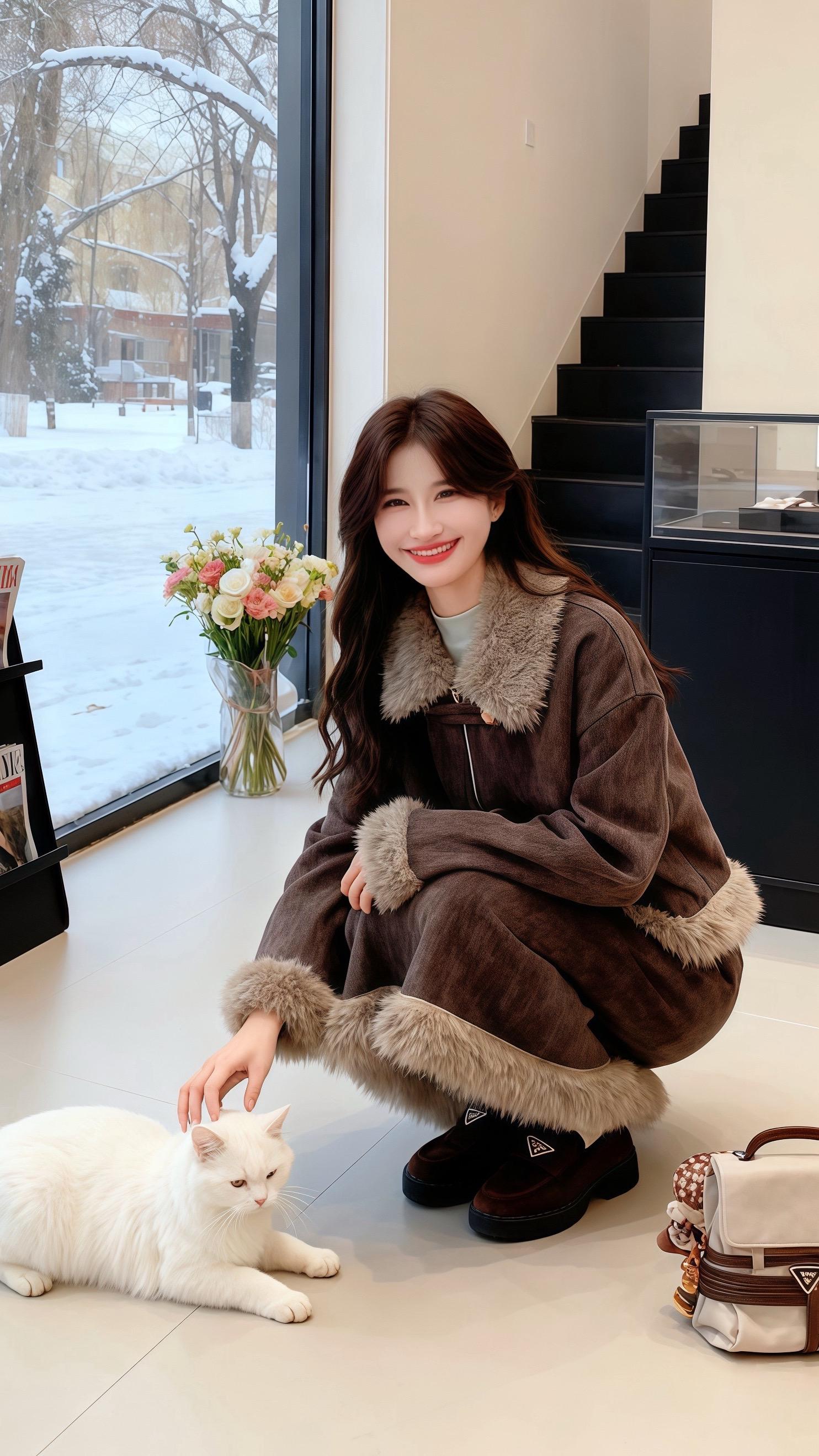 初雪簌簌落下,林薇站在橱窗旁,身上的深棕麂皮套装与模特款完美呼应。毛绒领口与袖口在雪光里泛着温柔的绒感,长款半裙的毛边随步伐轻晃,搭配那双带三角标的棕色乐福鞋,复古又时髦。