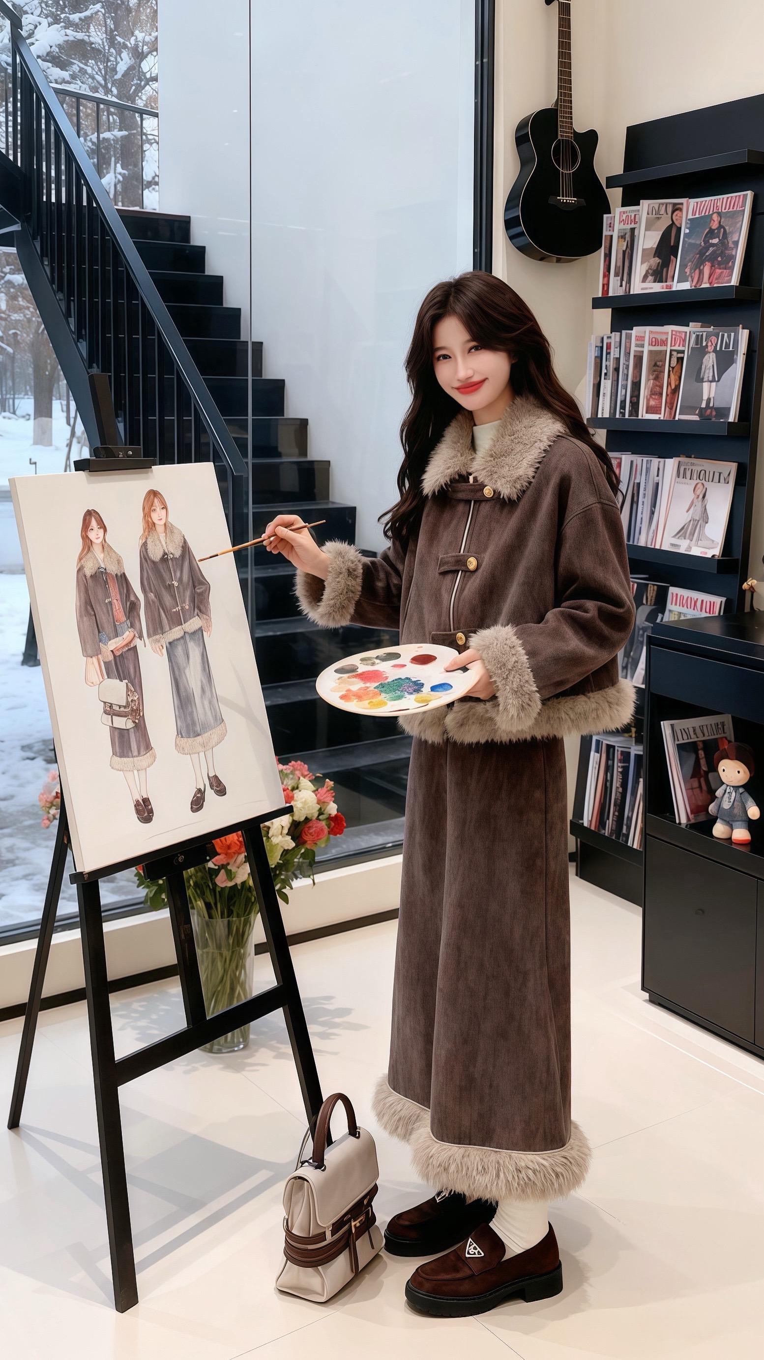 《雪天里的时尚画家:一身麂皮套装惊艳冬日》