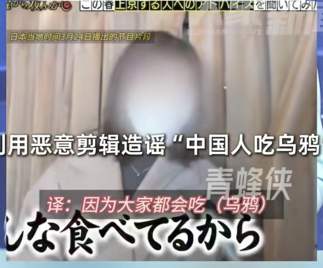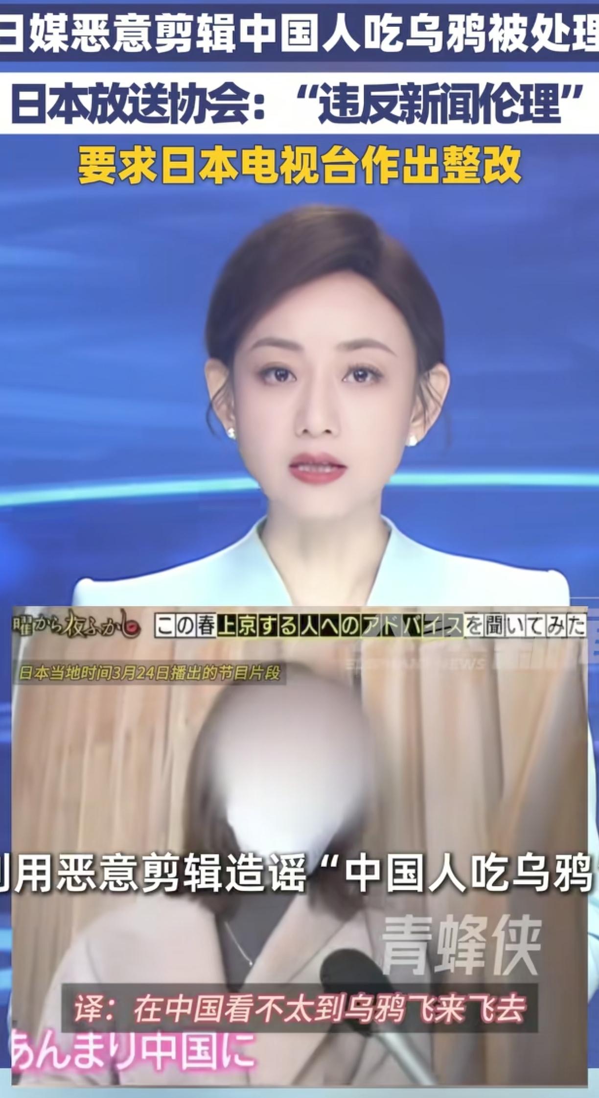 日媒恶意剪辑中国人吃乌鸦被要求整改 那个女人在采访中说“在中国不太能看到乌鸦飞来飞去,因为大家都会吃(乌鸦)”,说实话,从小到大,吃其他乱七八糟的都听说过,唯独没听说过吃乌鸦的,就是吹牛都没听说过,小日子是怎么那么轻易脱口而出的,尤其是小日子的正经新闻报道出来的,这种人被处理真是一点也不冤! 按他们这种播法,广东网友就大胆发言了,我这里就有一个真实的日本新闻:“日本人赤史的”,不管你信不信,反正我觉得他们干的出来! 小日子还是小日子,真是死性不改,衰样!