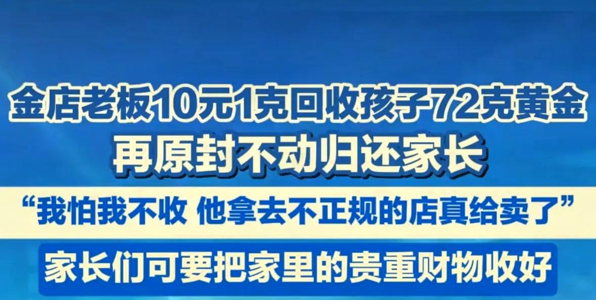 近日,四川雅安,一位金店老板,以10元每克的价格,回收了一个孩子72克黄金。 别误会他,他一看见孩子拿着这么重的黄金,心里就有数了——这肯定是孩子偷偷从家里拿的,压根不知道这玩意儿值七万多,就是个不懂行情的小糊涂蛋。 换作旁人,说不定偷偷乐着压价赚这笔“外快”,可他半点没往这方面想,满脑子都是慌:我要是不收,这孩子啥也不懂,转头就可能被别的黑店坑得更惨,万一被人骗去不正规渠道卖了,那七万多对普通家庭来说,就是天大的损失,大概率再也找不回来了! 他先把黄金稳稳攥在手里,转头就急得不行,赶紧拍视频发网上,对着镜头喊孩子家长来认领,业主群里也一条接一条发消息,生怕晚一步出岔子。等真联系上孩子家长,他一分钱没要,原封不动把72克黄金全还了回去,连句“辛苦费”都没提。 有人说他傻,放着到手的利润不赚,可我觉得他比谁都聪明!黄金再贵能标价,可这份做人的良心、做生意的担当,是多少钱都买不到的。现在太多商家眼里只有钱,恨不得把顾客的口袋掏空,可这位老板让我们明白,真正的好生意,从来不是赚多少快钱,而是守住底线,在别人难的时候伸个手。 这样有温度、有良心的老板,就该被全网夸,就该他店里天天爆满!