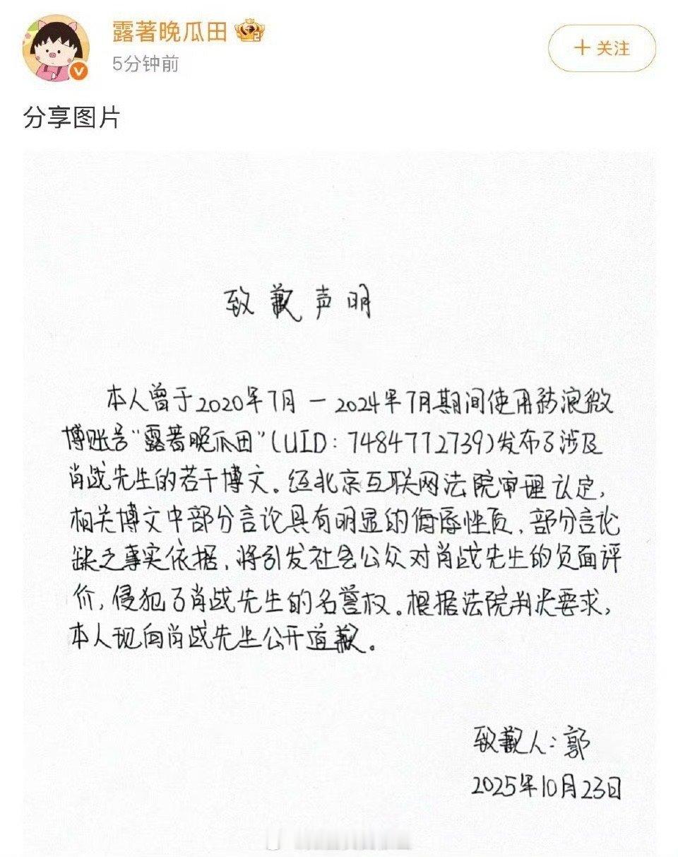 又一个黑号手写道歉信给肖战道歉了还有几个经常出现在热点造谣的大黑号要保重啊,说不