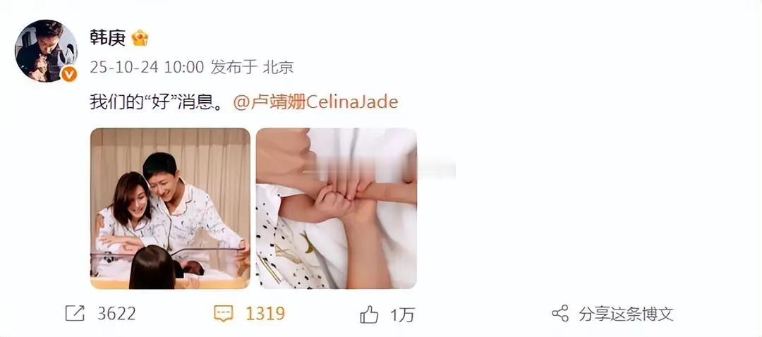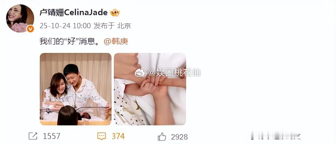10月24日上午,韩庚和爱妻卢靖姗在个人社交平台发文官宣二胎出生的好消息,夫妻俩附上相同文案:“我们的‘好’消息”。所以,卢靖姗和韩庚二胎是男宝宝诶,儿女双全的他们凑成“好”字,真是恭喜恭喜了。韩庚和卢靖姗此次不仅发布相同文案,连时间都是卡的上午十点整,真的是小细节都充满高糖,甜齁了。