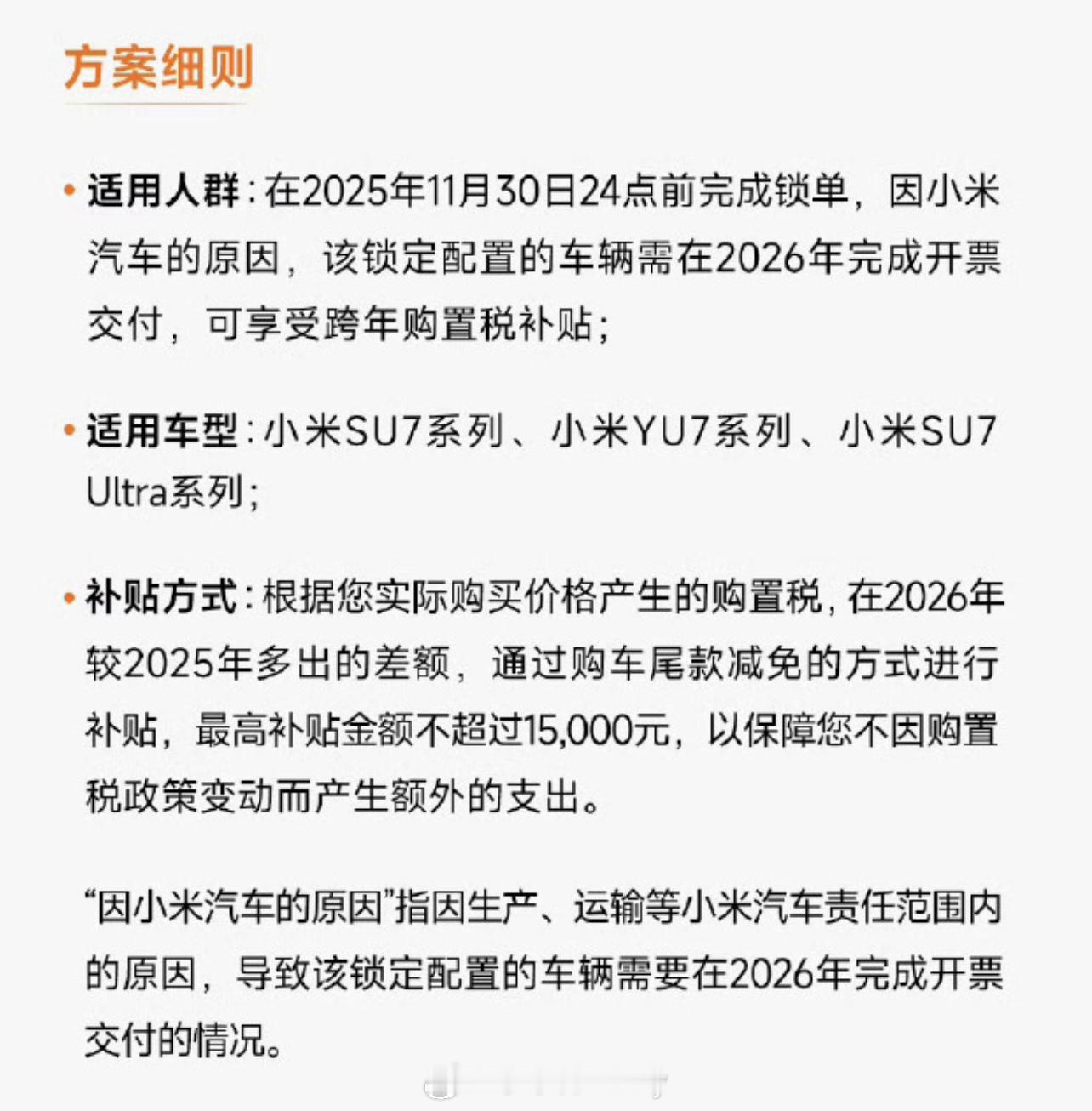 “因小米汽车原因,需在2026年完成开票交付,可享受跨年购置税补贴。