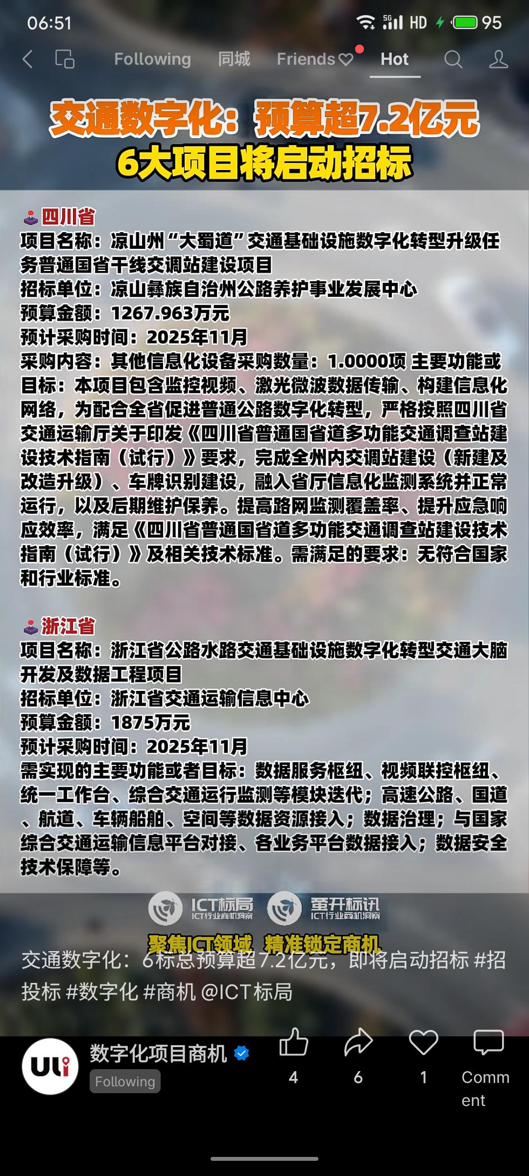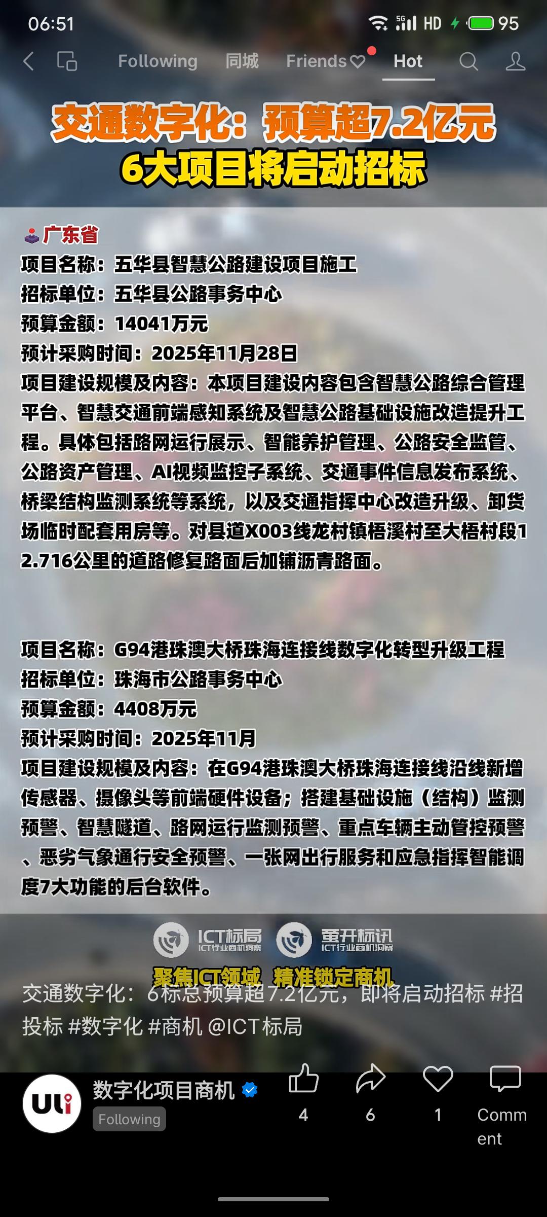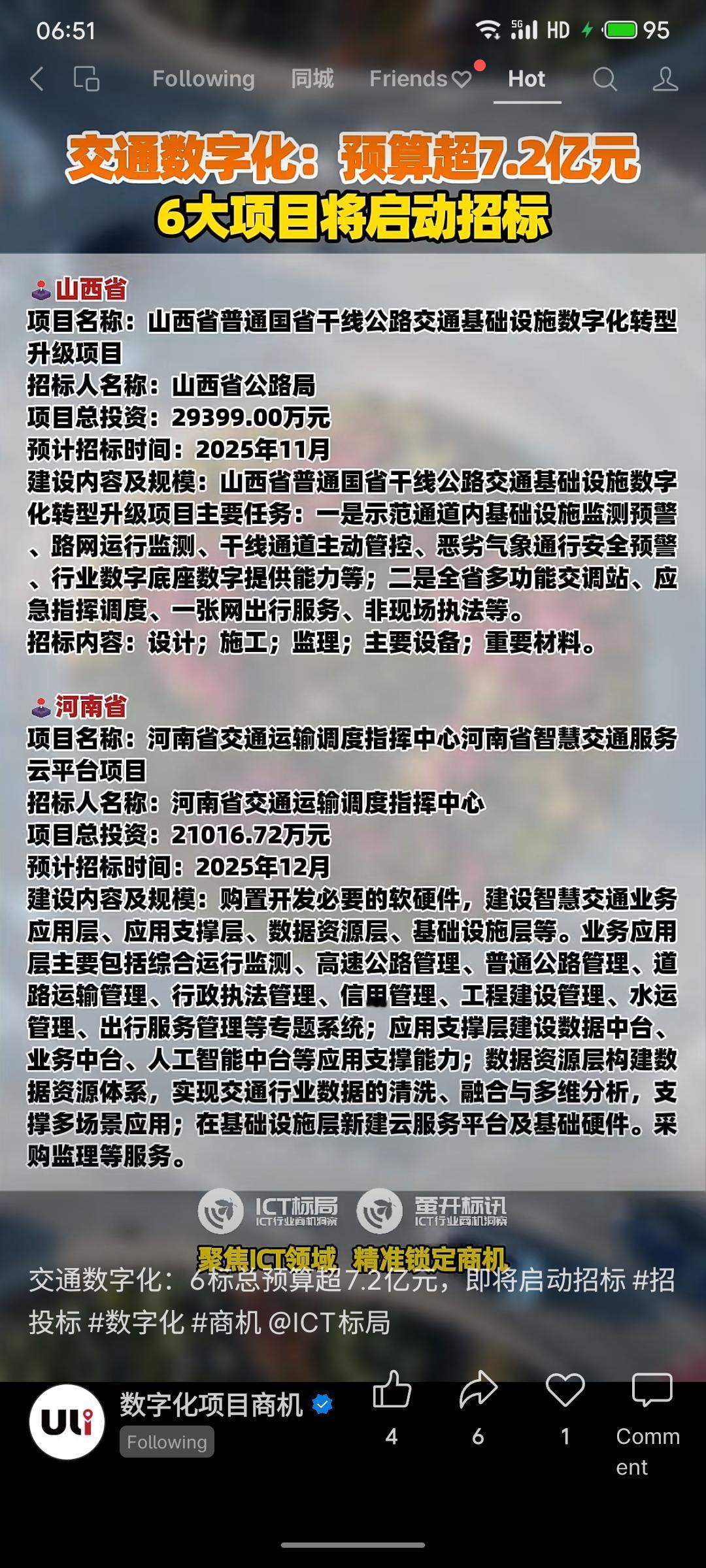近期,全国多地加速推进交通基础设施数字化升级,六个相关项目即将启动招标,总预算超过7.2亿元。这些项目覆盖山西、河南、广东、四川、浙江等多个省份,建设内容涵盖智慧公路、智能航运、车路协同等领域,重点包括路网运行监测、智慧交通云平台、基础设施数字化改造及“交通大脑”开发等。此举标志着我国交通数字化转型正从技术探索迈向规模化落地阶段。