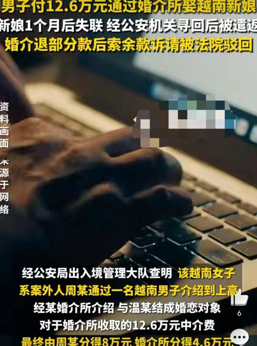 男子花12万娶越南新娘,1个月后新娘失联被遣 男子花12万娶越南新娘,1个月后新娘失联被遣返,剩余钱款难追回 江西上高的温某,2017年想找对象,通过婚介所介绍了一位越南女子,前后给了婚介12.6万元,还签了承诺书,约定若女方跑了或被遣返,婚介要退钱,本以为稳妥,结果麻烦才刚开始。 刚和越南女子相处不到一个月,对方就突然失联了。温某急得没办法,只能去派出所报案,民警帮忙找到人后,却发现女子手续不合规,最后被出入境管理大队遣送回了越南,温某这才慌了神。 他找婚介要说法,经公安局协调,婚介当场退了4.6万元,可剩下的8万元,婚介说被案外人周某分走了。原来这越南女子是周某通过越南人找来的,周某拿了8万,婚介拿了4.6万,温某想再要回钱,只能找周某。 可周某哪那么好找,温某只能起诉婚介,要求对方退剩下的8万。结果法院审理后,直接驳回了他的请求,理由是婚介从事涉外婚姻介绍,违反国家规定,双方的中介合同本身就是无效的。 法院还提到,当初公安局协调时,已经约定剩余8万由周某返还,现在温某再找婚介要,于法无据。这意味着温某这8万元,大概率是要不回来了,12.6万最后只拿回4.6万,亏得实在厉害。 其实类似的事儿之前也发生过,河南有个男子花15万娶缅甸女子,后来发现女子是被拐来的,不仅人被解救回国,男子还差点因“收买被拐卖妇女”担责,钱也打了水漂,和温某的遭遇大同小异。 为啥总有人掉这种坑?一方面是部分人着急结婚,又没合适的渠道,就想着走“捷径”;另一方面是婚介抓住这种心理,吹嘘“人靠谱、有保障”,却故意隐瞒涉外婚姻介绍违法的事实,误导人交钱。 国家早就明确规定,禁止任何机构和个人从事涉外婚姻介绍活动,就是为了防止有人借“介绍婚姻”搞诈骗、人口贩卖。温某当初要是了解这条规定,也不会轻易相信婚介,落得人财两空的下场。 而且这种“花钱娶来的婚姻”,本身就没感情基础,女方要么是被胁迫,要么是为了短期利益,一旦有机会就会离开。就算没失联,手续不合规的问题早晚会暴露,最后还是会被遣返,根本没法长久。 温某的经历也给所有人提了个醒:结婚没有捷径可走,千万别想着“花钱买对象”。这种方式不仅违法,还容易遭遇诈骗,最后钱要不回,可能还会惹上法律麻烦,得不偿失。 要是真有结婚的需求,不如通过正规相亲平台、亲戚朋友介绍,虽然可能慢一点,但至少安全靠谱。遇到声称能“介绍外籍新娘”的,不管对方说得多好,都别相信,这些基本都是骗局。