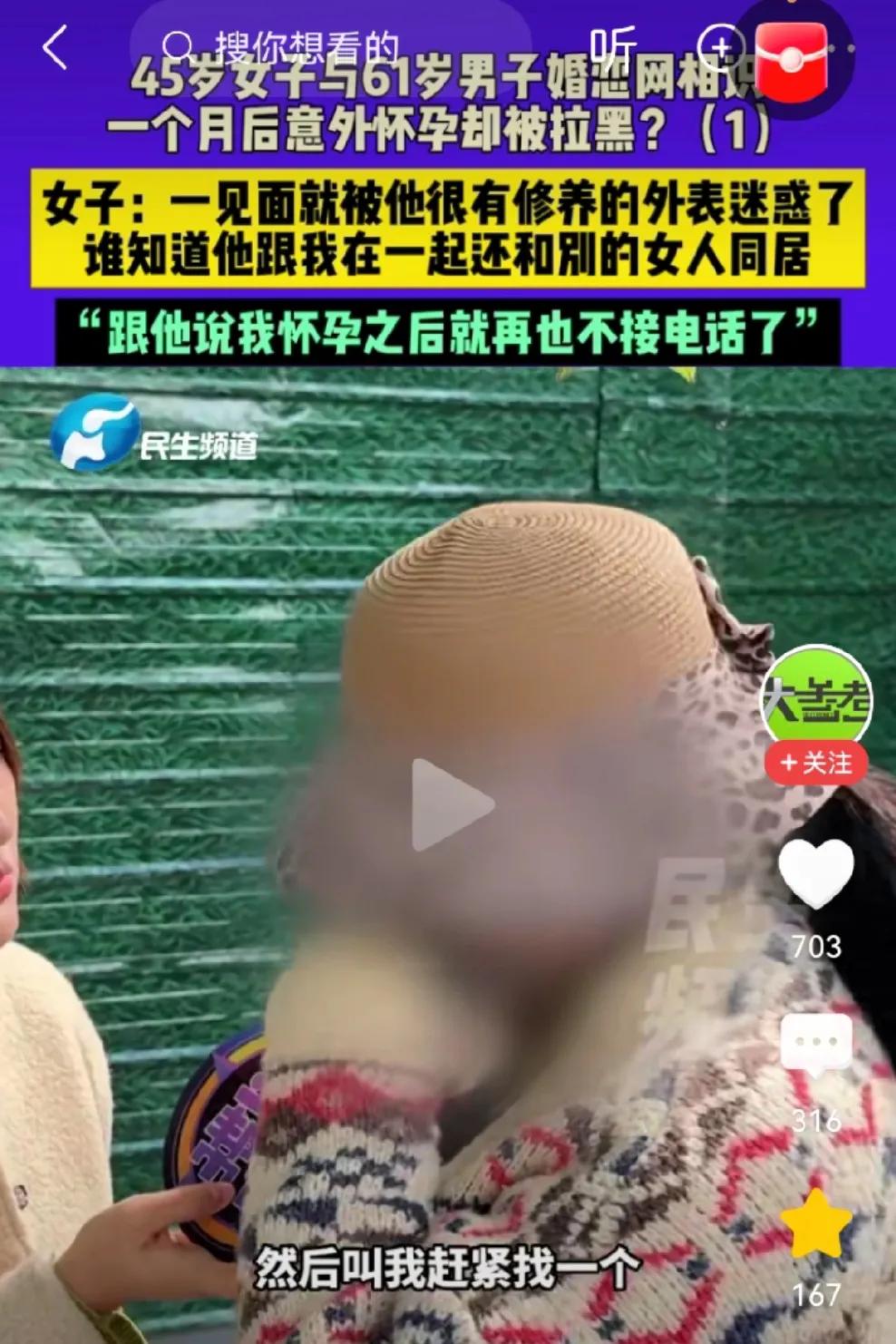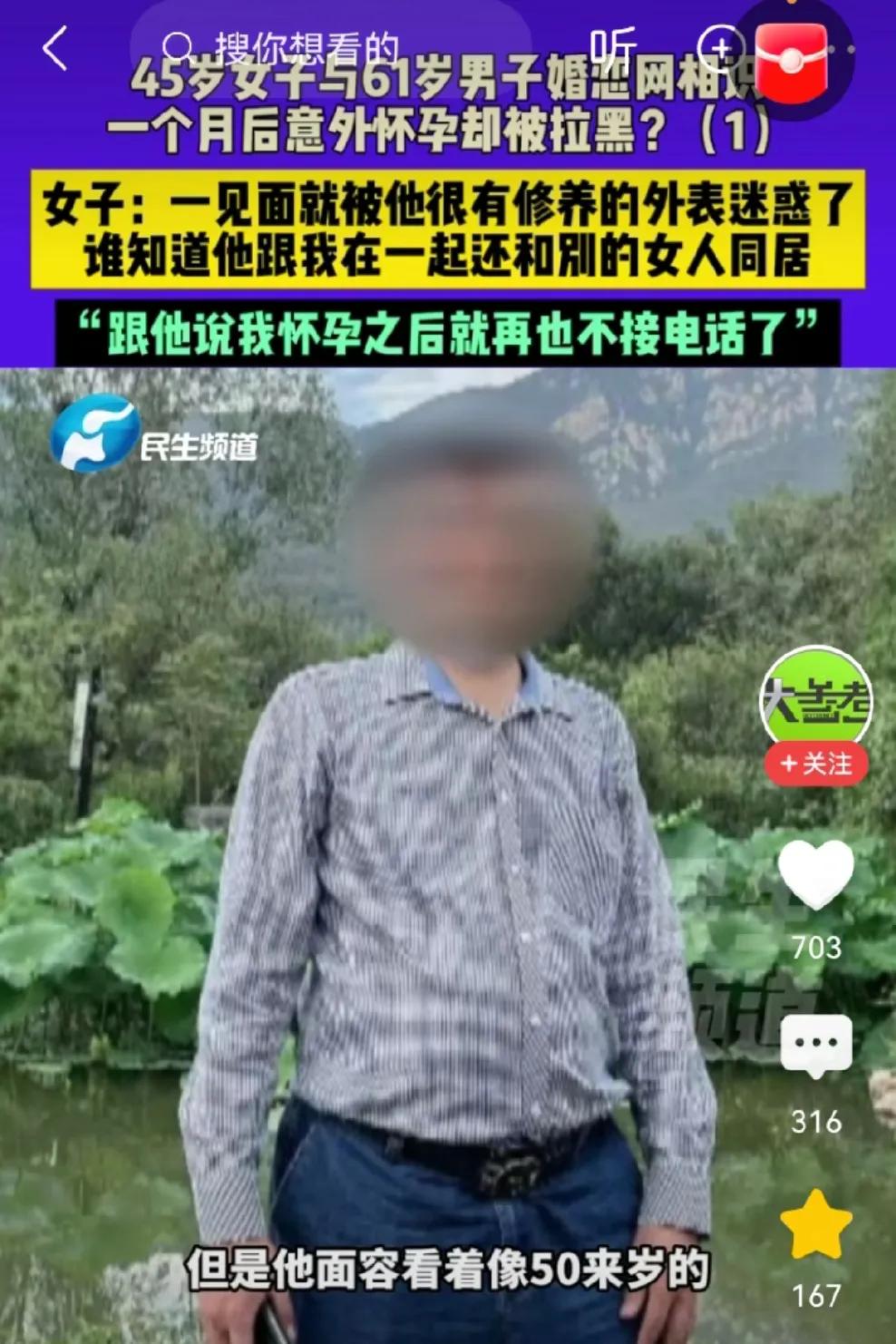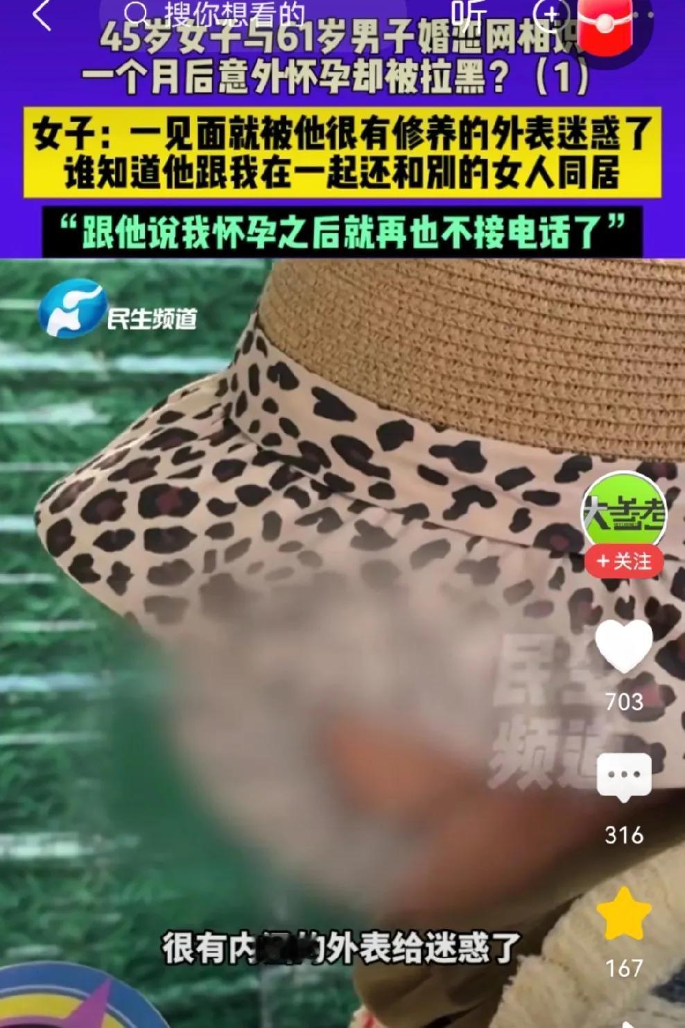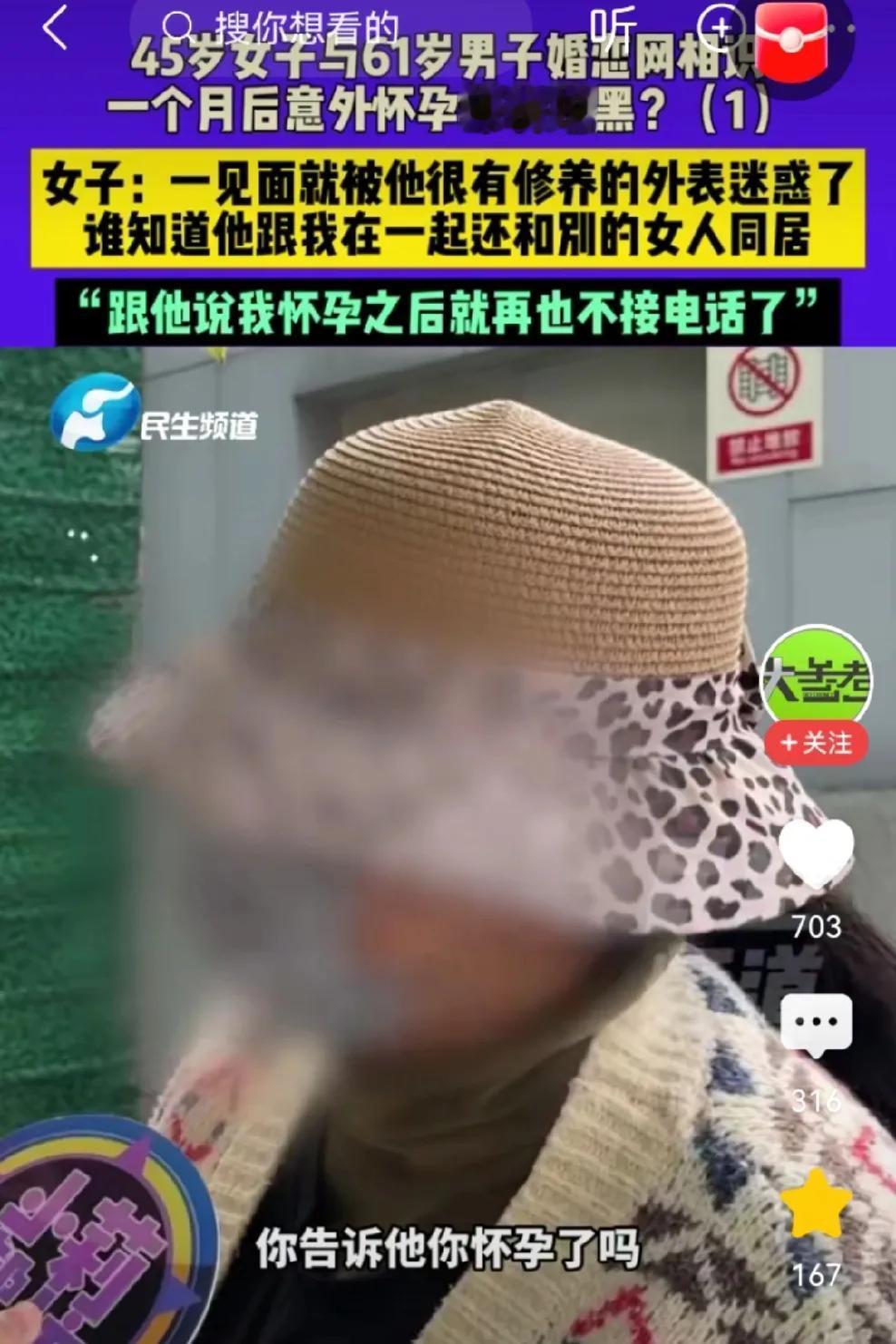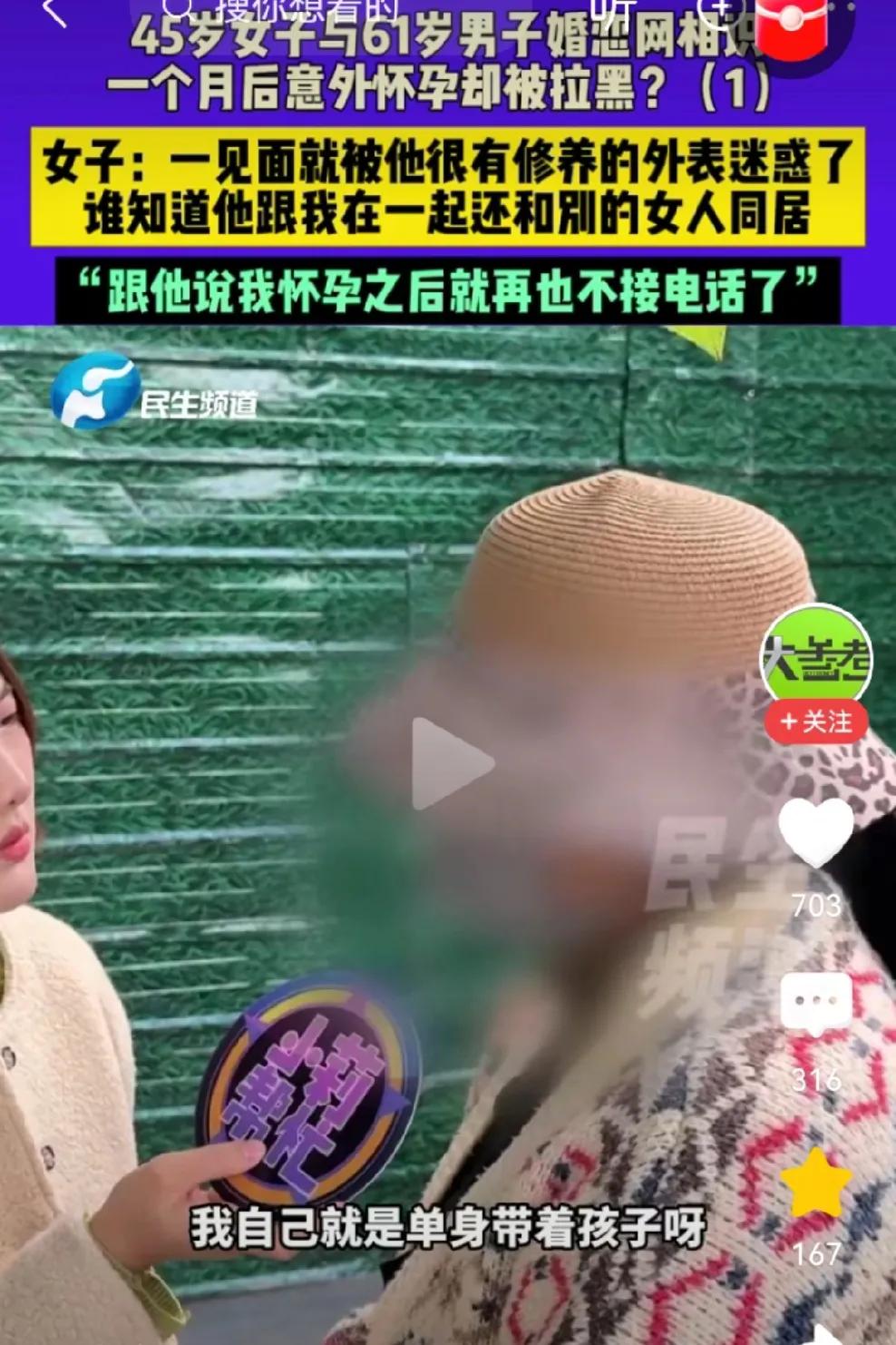 “你的孩子在我的肚子里,我感到恶心!” 45岁的安女士,万万没想到,61岁的男友会背叛自己。 近日,郑州的安女士对着记者泪如雨下。 原来,她45岁了,又是个单亲妈妈,她的母亲让她找个老伴来分担一下生活的重担。 可让她没有想到的事,一件接着一件。 安女士与61岁男友是在婚恋网上认识的,一见面,就觉得男友温文尔雅,立马被那种温和有修养的气质吸引住了。 男的虽然61了,但看着也就50来岁,安女士想着大点也没关系,只要对自己好就行。 然后,他俩就同居了,接下来发生的事,让安女士五雷轰顶。 有一次,男友带着安女士去自己家,一推门一个女人在他家里,看着跟男的关系不一般。 安女士一下子懵了! 男友慌忙解释,他俩早就分了,是对方一直纠缠自己,并保证跟那个女的一刀两断,好好跟安女士过日子。 安女士觉得知错就改就好,可没过多久,安女士发现自己怀孕了。 她有点惊慌失措,觉得45了居然还会怀孕,但她还是把这件事告诉了男友。 没有想到男友直接消失,甚至不接电话,还解释说,我家一共才待了一个多月,很明显,他不想认账。 安女士被他举动惹怒了,又觉得非常委屈。 感觉安女士太可怜了,又觉得她太大意了,真的不应该那么快就同居,还不做避孕措施。 这下该怎么办,45岁了,如果打胎对身体危害很大。 而且,两个人还没有进入婚姻,男的说不负责,法律上也拿他没辙。 所以女性找对象,特别是中年女子找对象,一定要十分慎重,不能被对方的承诺迷住眼睛,守住自己的底线才能不会陷入困境之中。