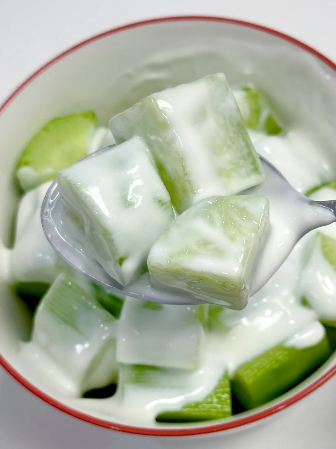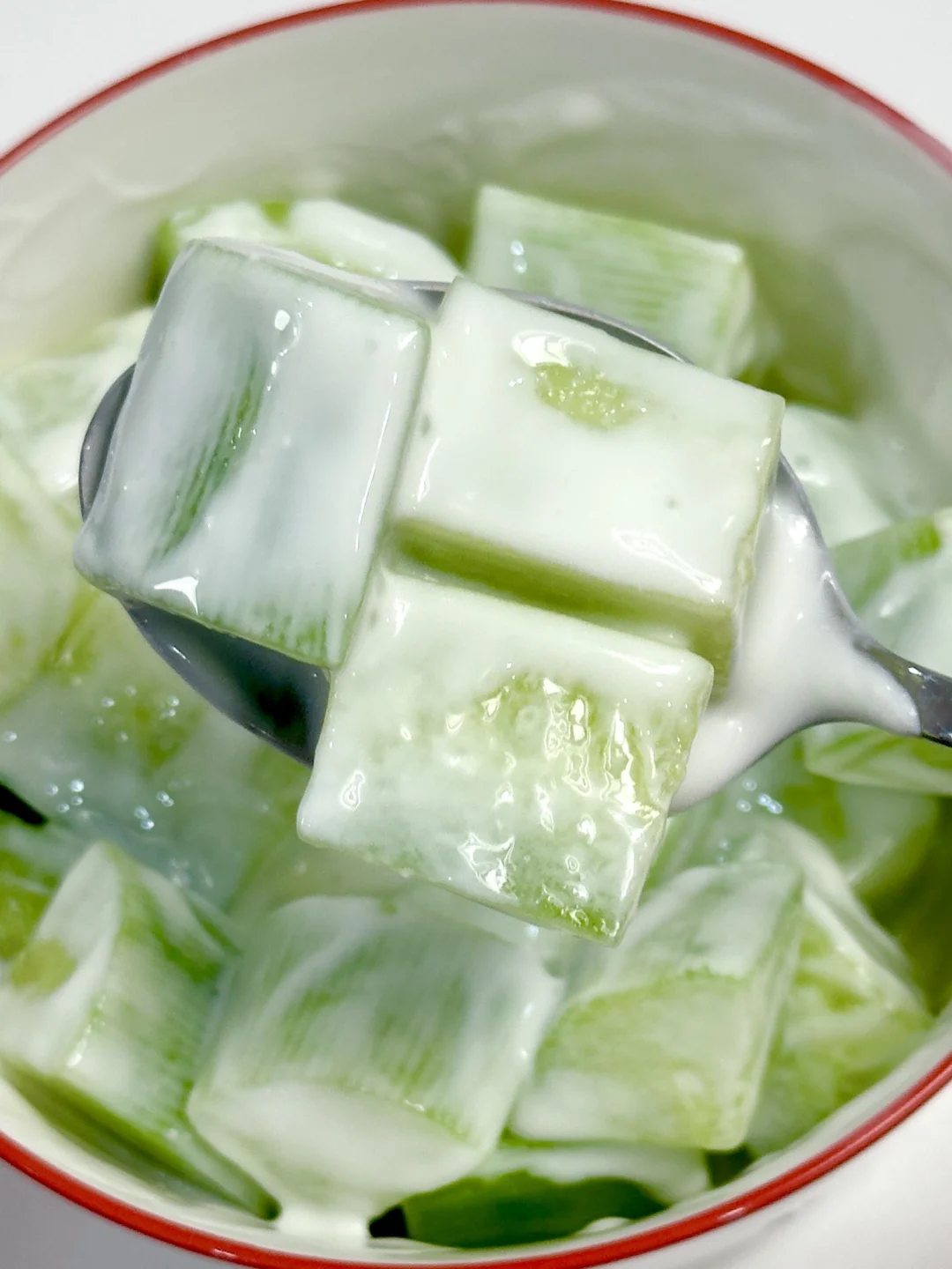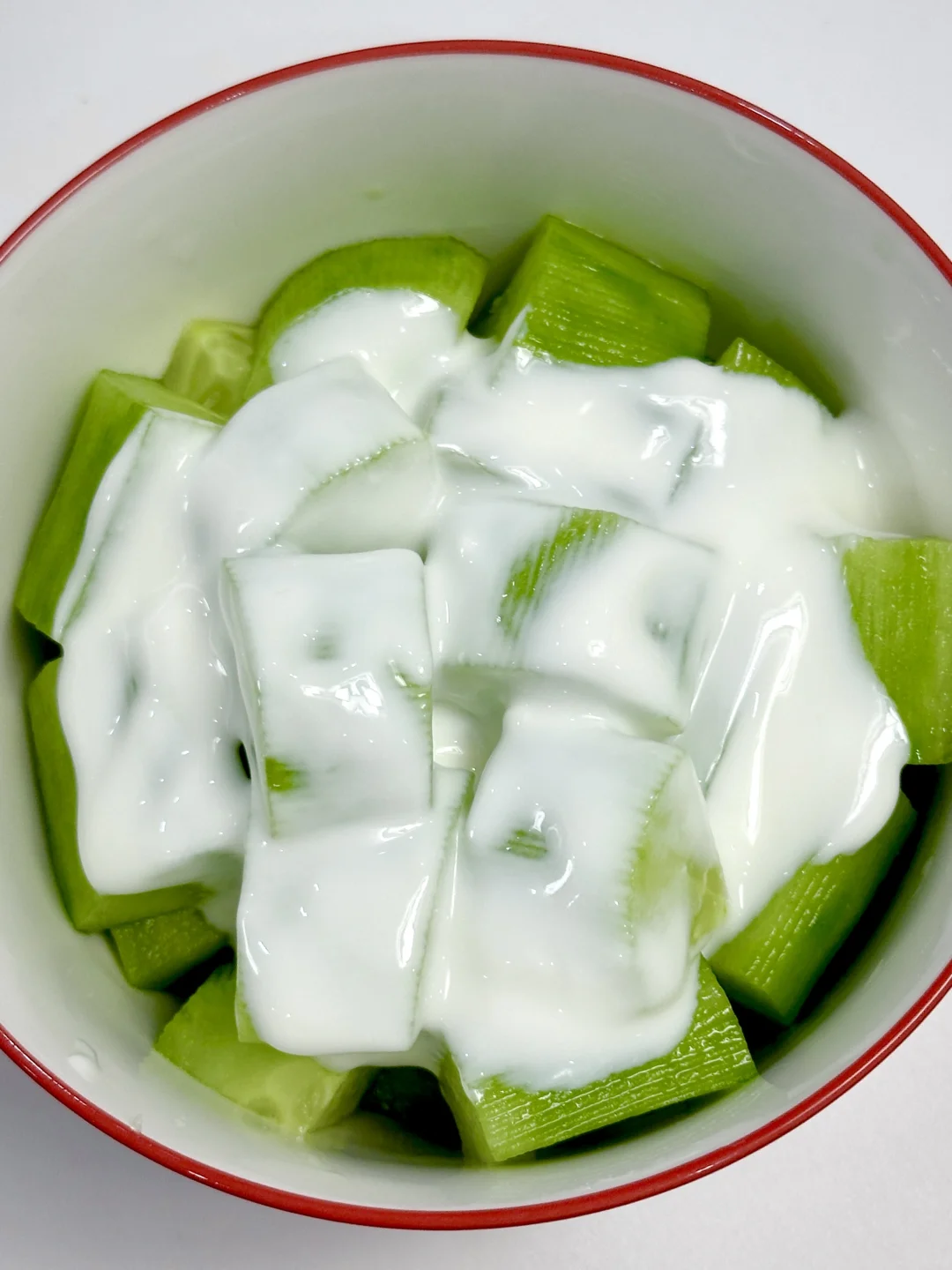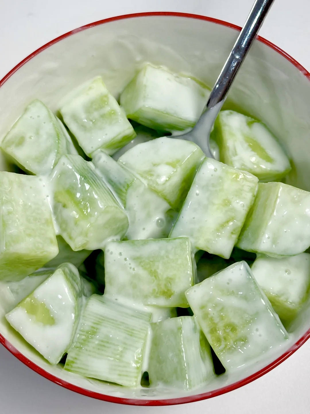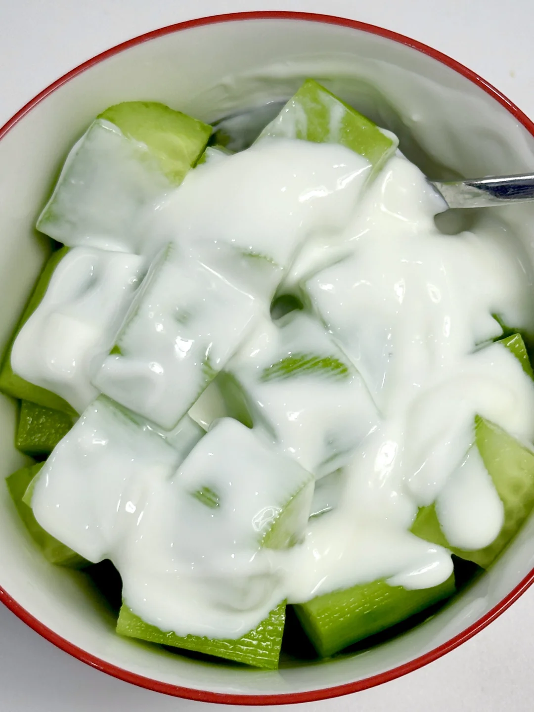 分享个巨掉秤的黄瓜拌酸奶!!巨好吃!非常清爽的黄瓜沙拉!口感爽脆!一口下去清爽好吃!而且巨通便!嘎嘎掉秤! 🥒黄瓜切小块,倒入酸奶拌匀即可