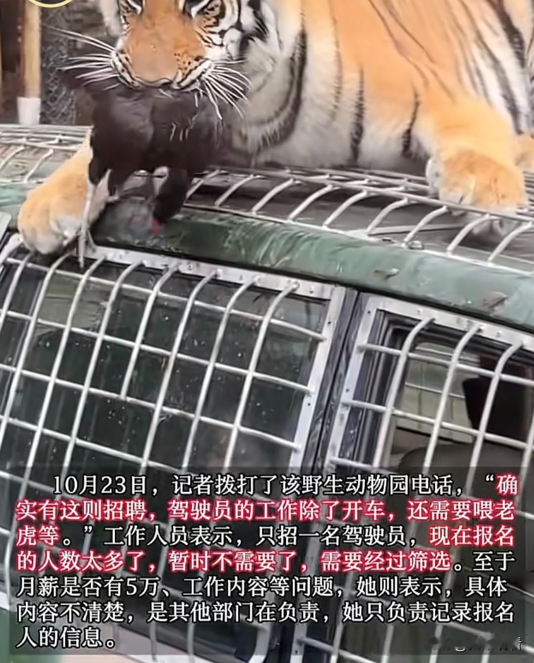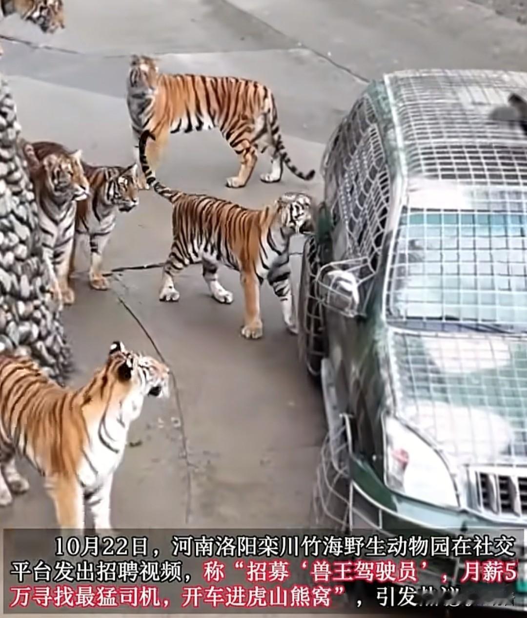 月薪5万闯虎窝!洛阳动物园这岗太疯了,两千人抢破头… 我刷到洛阳栾川竹海野生动物园的招聘,我直接瞳孔地震!! “开车进虎山熊窝,直面兽王怒吼,月薪5万”,这哪是找工作,简直是现实版“猛兽区闯关”啊🔥 岗位有多刺激?看完手心冒汗… 不是普通司机!要开加固车进猛兽散放区带游客,还得亲手喂老虎、黑熊这些大宝贝!一天喂上百只活鸡鸭就算了,据说老虎扑车时玻璃都在震,这心理素质得多强啊… 招聘细节全扒了! ①报名疯了: 就招1个人,24小时涌来两三千人报名,现在都暂停登记了,得投简历筛选。 ② 要求不算高: C1驾照就行,但必须胆大心细反应快,懂点动物习性更加分。 ③薪资实锤: 至于月薪是否有5万、工作内容等问题,有工作人员表示具体内容不清楚,是其他部门在负责,她只负责记录报名人的信息。如果说月薪5万是真的!毕竟天天跟猛兽贴贴,这钱赚得够惊险! 网友吵翻了… 有人说“5万月薪配得上这份危险,敢去的都是勇士!”,也有人觉得“像营销噱头,花60万办个招聘,全网都记住这动物园了”。我倒觉得,不管是不是营销,真能拿下这岗的,也太酷了吧! 目前还在筛选阶段,我真想知道最后是谁能当“兽王驾驶员”!有没有懂行的朋友,这岗到底值不值得冲啊?