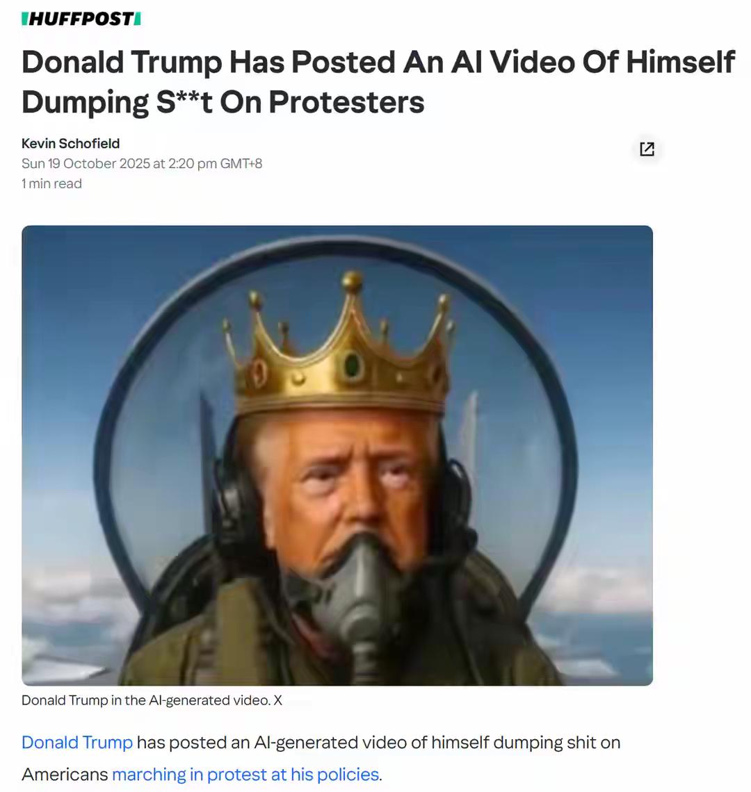 哈哈,特朗普领悟了“道”的真谛! 美国最近爆发了多场针对特朗普的“不要国王”的抗议活动,很多抗议者还穿上了充气青蛙服,讽刺特朗普“青蛙男孩”的绰号。谁知特朗普18日在社交平台上发布了一段头戴王冠、驾驶战斗机、在抗议者头顶上空投大便的AI视频,太抽象太刚了,哈哈! 特朗普一定学过《庄子·知北游》,知道“道在屎溺”这个真理,在飞机上向示威者空投大便,喻意着自己的道行已经很高很高了![偷笑]