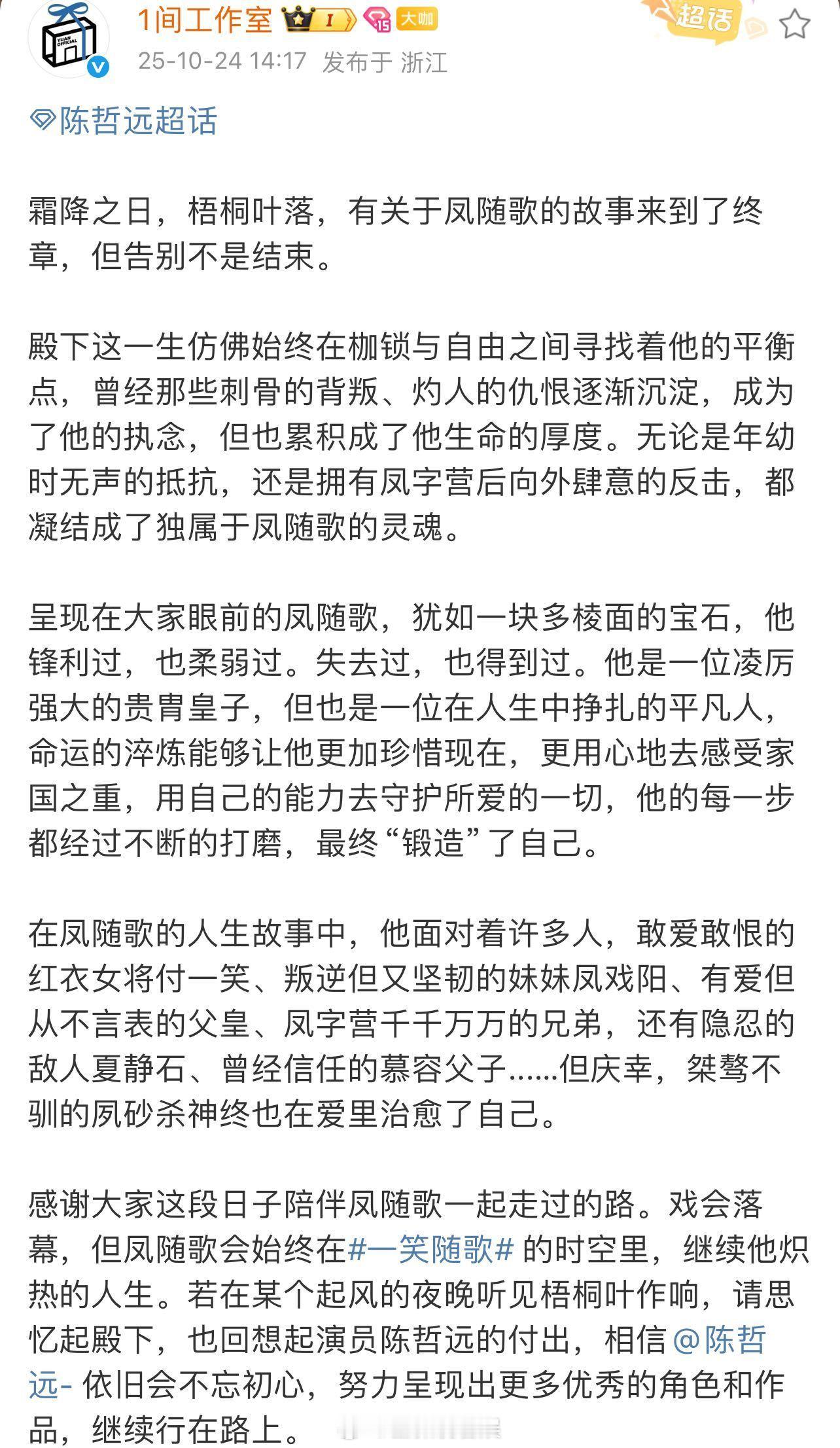 陈哲远要和随歌说再见了和工作室发布的《一笑随歌》收官小作文真的给人看泪目了,远子诠释的真的很好,演出了名场面很多的夙砂杀神,看剧的时候完全沉浸了,这次要和远子一起说再见凤随歌了...