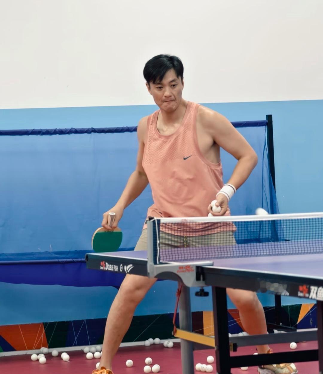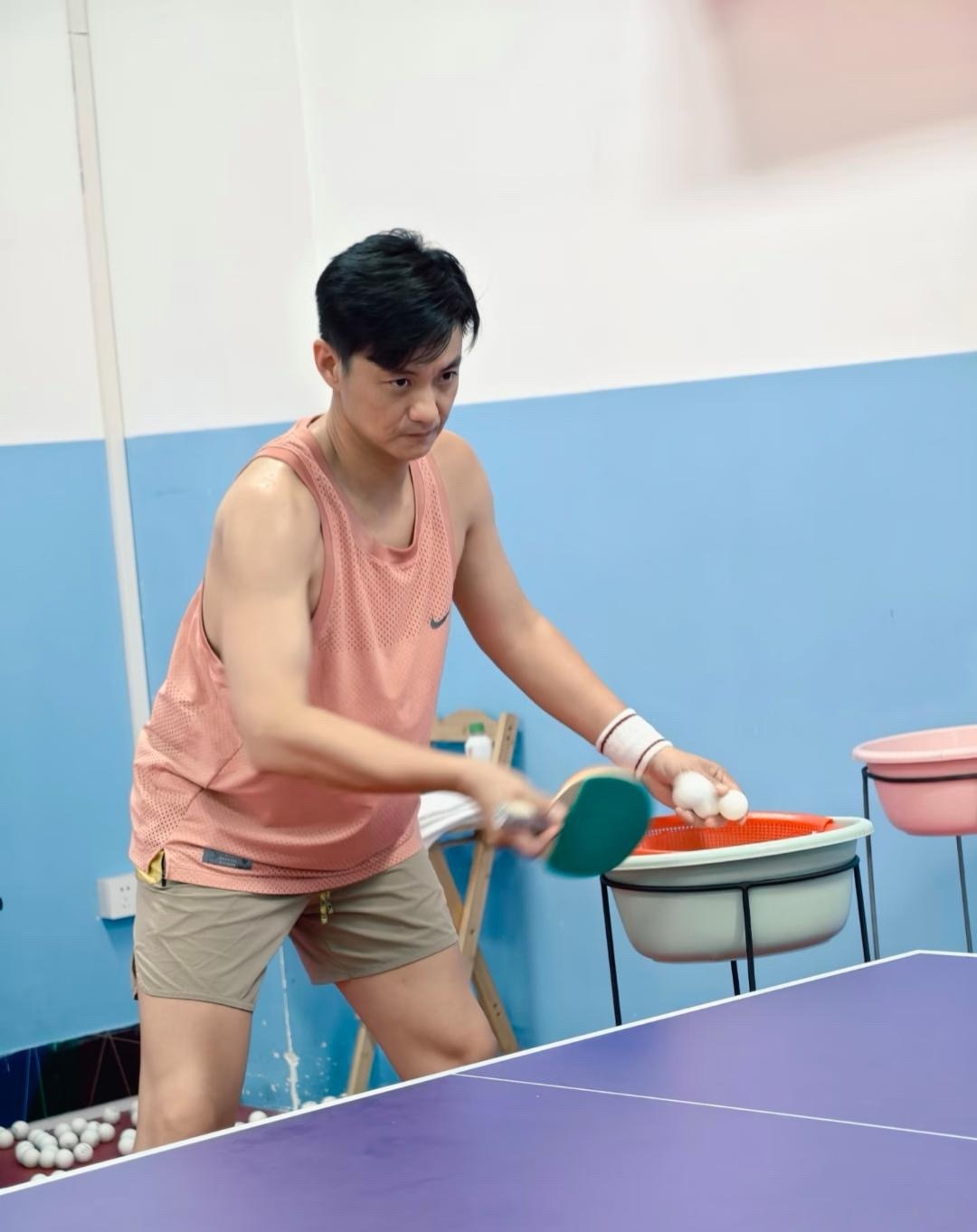 43岁周一围在球馆打乒乓球,他穿着背心,身材非常瘦,整个人苍老了不少,但还是挺帅气的。