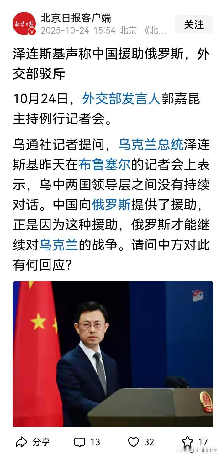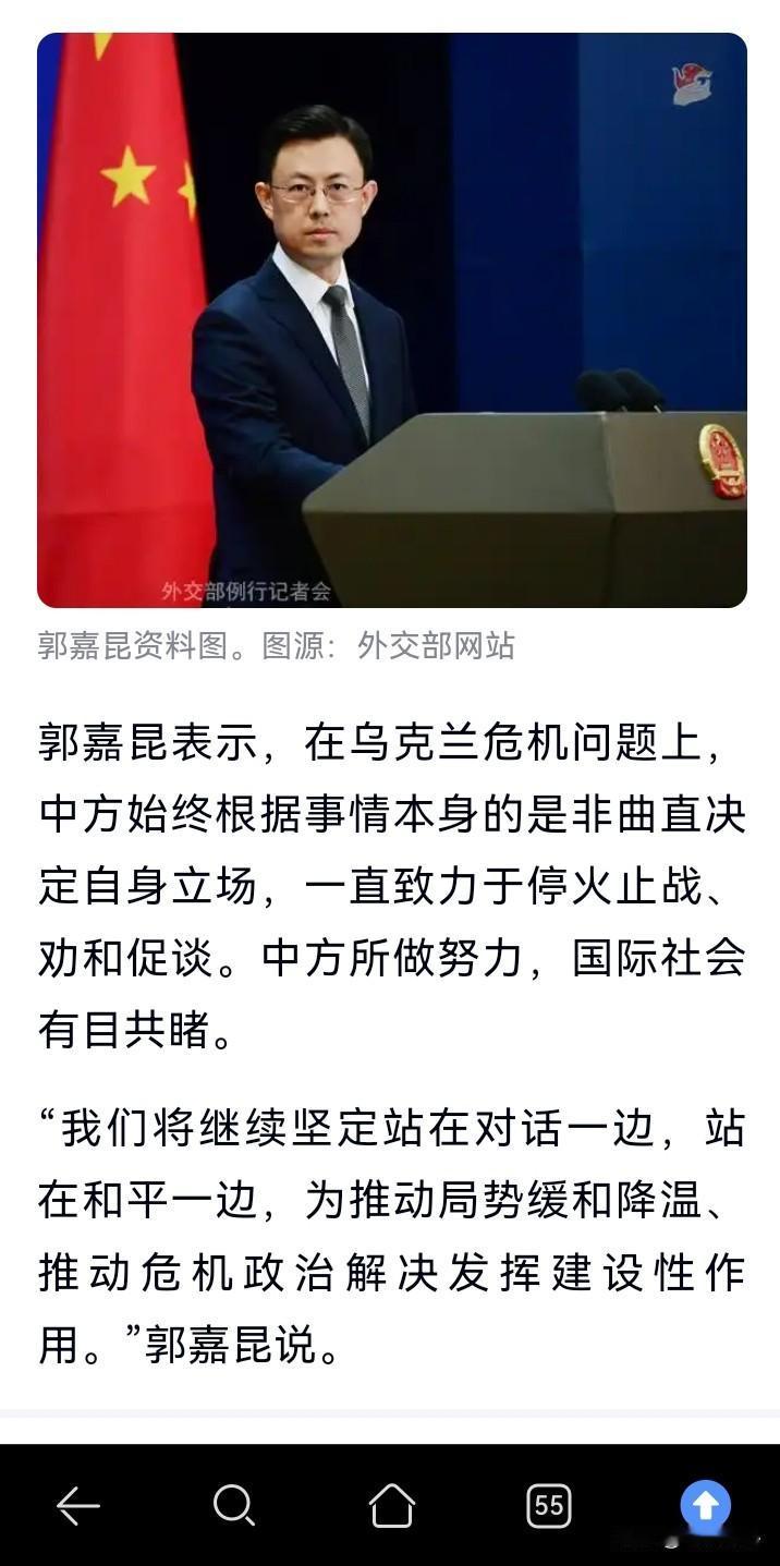 泽连斯基又说中国支援俄罗斯,这是他的一贯观点,正如一个月前,他在联合国大会上,一分钟就三次提到中国。 确实,他要给自己找一个,拿了这么多西方国家先进武器,还打不过俄罗斯的理由啊! 其实,他应该看看图一至三,我们驻联合国副代表耿爽的讲话,那一次就说得太明白了,“假如是中国真的向俄罗斯提供军事补给,俄乌战场上的局势早就不是这个样子了。” 在乌克兰危机这个事情上,我们中国一直都是根据事情本身的是非曲直决定自身立场,致力于停火止战、劝和促谈。中国站得直,行得正,无可指摘!