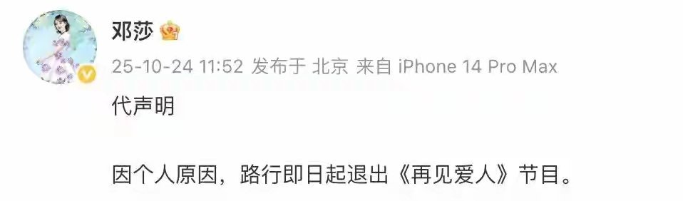 演员邓莎代发声明:因个人原因,路行即日起退出《再见爱人》