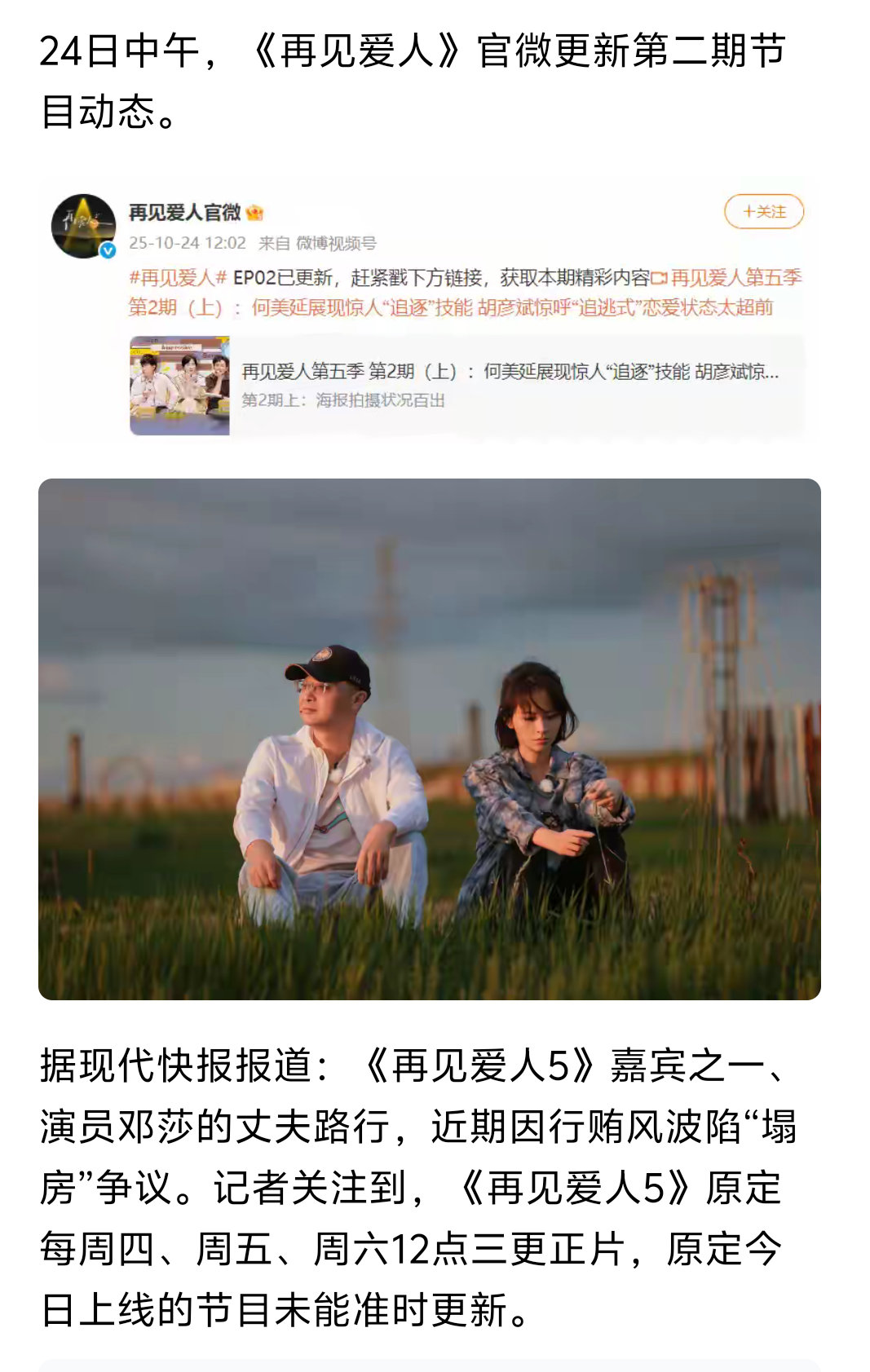 演员邓莎代发声明:因个人原因,路行即日起退出《再见爱人》10月24日,据蓝鲸新闻,刚刚,邓莎代发声明,称因个人原因,路行即日起退出《再见爱人》节目。《再见爱人5》嘉宾之一、演员邓莎的丈夫路行,近期因行贿风波陷“塌房”争议。而邓莎提到,两人因为怀孕选择结婚,最近几年已经是“半分居状态”,平时的相处模式是有事儿说事,有时候一个星期都没有一条短信。她曾在15日节目放出的预告片里坦言,自己面对的是“丧偶式婚姻”。