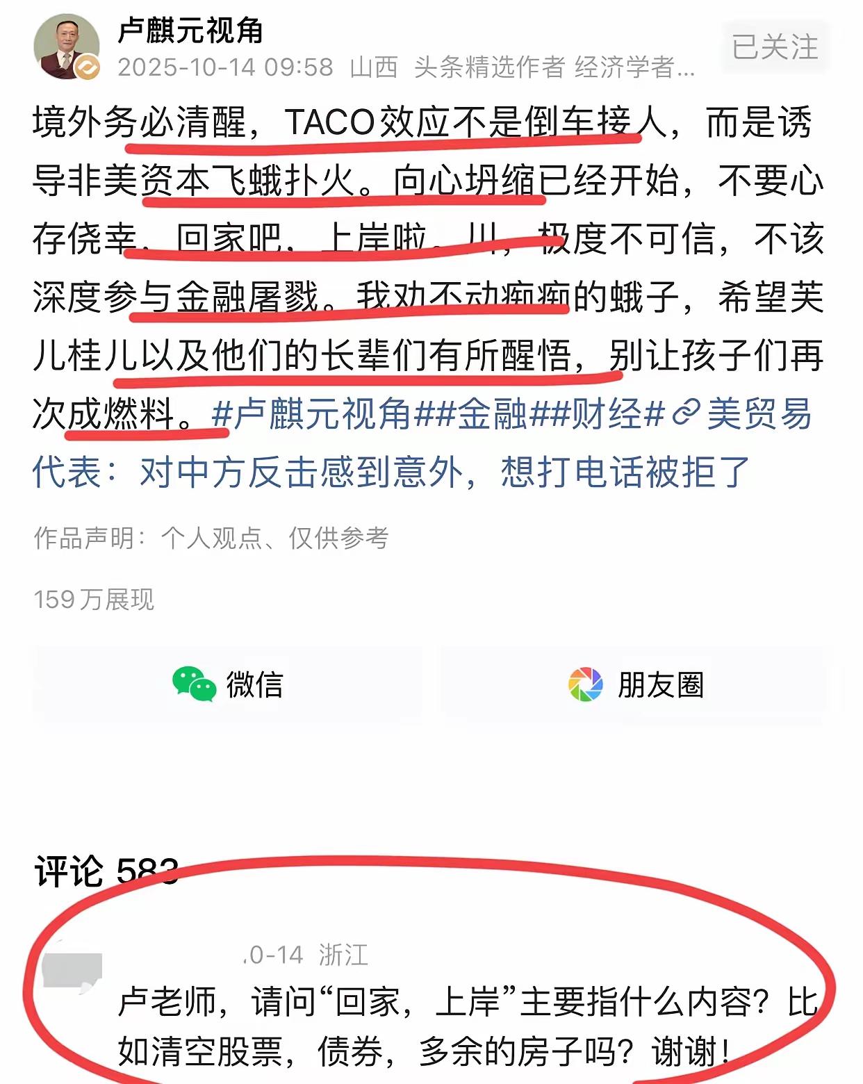 “飞蛾扑火”还是“狼来了”?——卢麒元的紧急号角在呼唤谁 “飞蛾扑火——美帝元崩溃开始!”卢麒元一声吼,微信群瞬间安静。我盯着屏幕,仿佛看见美元像塌缩的恒星,正把海外华资吸向黑洞。 先把术语翻译成大白话:所谓“上岸”,就是减持美元资产、换回人民币、躲进国债或黄金;所谓“回家”,是把总部、账户、家族信托迁回大湾区或海南自贸港。 我部分赞同:美元霸权确实松动,美债曲线、财政赤字、去美元化都在闪黄灯。但“崩溃”与“调整”隔着十条街——利差仍近400基点,汇差还在7.2,资本回流的最大门槛是“赚不赚”,不是“听不听”。 更值得玩味的是,卢总的“超级建议”多年未落地,恰恰卡在三大利益链:出口商靠弱美元换汇、离岸信托靠美元保单、港股美元债靠低息滚续。谁动谁疼,自然“百思不得其解”。 假如明年美元不崩反而加息,那些听号回笼的资金,会否成了A股和人民币的“高位接盘侠”?评论区立帖为证,一年后咱们一起挖坟!