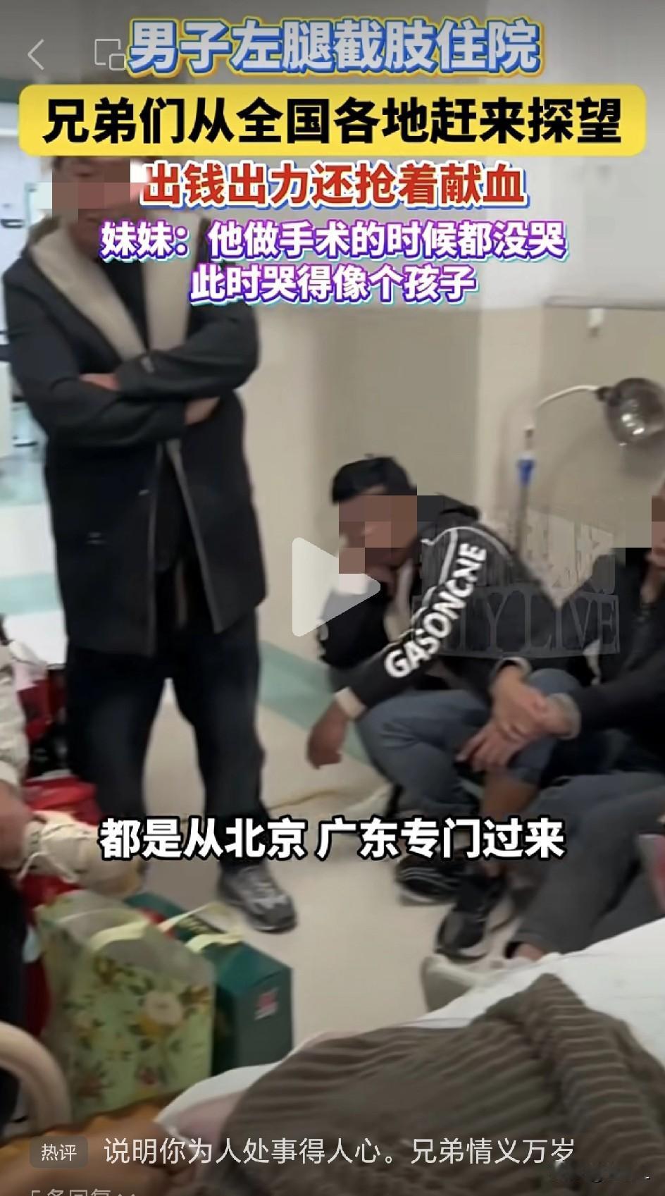 他没在截肢手术时哭,却在一群男人挤进病房时哭了,一个汉子哭得像个孩子! 成年人的世界,人脉是笑话,友情是神话! 10月22日,河南郑州。男子因意外左腿截肢住进了ICU。 刚从ICU转入普通病房,从全国各地赶来的发小们就赶来看望他,有的来自北京,有的来自广东,天南海北。 发小们都是男子从小一起长大的小伙伴,来了转了钱,带了东西。一听到医院血库的血紧张,二话不说,挽起袖子争相献血。 而躺在病床上的汉子,受苦受累没哭,左腿截肢做手术没哭,看到挤满病房的发小们,曾经坚强的汉子哭的像个孩子。 在父母亲人面前,他是家里的顶梁柱,不敢哭不敢垮,但在兄弟面前,他终于放下了自己努力维持的坚强。 被感动的何止男子,还有镜头前千千万万的网友: “哥们人缘好三观正好人一生平安祝你早日康复!” “真朋友就是这样的,平时没怎么联系,你有事他一定在!” “这份兄弟情此生无憾了!” “兄弟情深义重。” “一辈子的好兄弟!” “说明这哥们人品好。” “在兄弟面前哭不丢人。” “证明交对朋友了,也证明他平时为人不错!” “患难见真情!” 这样的兄弟情,确实让人感动。 这让我想起了我的发小,常常好几年不联系,联系一定在的那种。 我因为读书离开了家乡,留在了青岛安家。朋友留在老家,是一位妇产科医生。 后来因为家里变故,朋友自己出来开办医院,生意做的风生水起,是老家县城有名的企业家。 曾经我还没买房时,朋友那时候已经很有钱了,她说,“你要是买房钱不够,一定要告诉我,我这儿有闲钱!” 我很痛快的、笑盈盈地答应,但从来没开过口。因为买房不是救命,不过是改善自己的居住环境,这是自己的事。 虽然我们常常不见面,也没有经常联系,但见面从来没有隔阂感。谈起来各自的家庭、状况,从来不会考虑谁家有钱有势,谁又比谁低一等,又或者谁要讨好谁。就好像我们天天在一起,像我们小时候一样。 我公公重病的时候,我们一边往回赶,我一边联系朋友,帮我们安排了科室主任来当主治医生。 公公去世后,除了亲戚,所有同学朋友我们都没有通知。但不放心的朋友还是知道了,冒着严寒带着老公赶来送了老爷子最后一程。 真正的朋友,不在你风光时敬酒,而在你倒下时献血。 “不打扰”却“随时能救命”的友谊,正是我们对抗现实孤独感的“精神血液”。 珍惜那个可以成为彼此“精神血库”的人。朋友不在多,人生得一知己足矣! 信息来源于都市现场,侵联删!