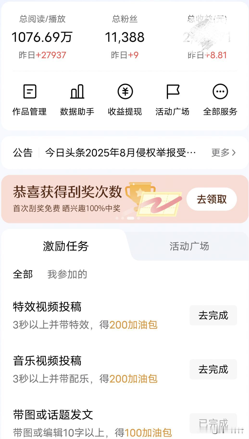 头条主页新版面你怎么看? 今天发现头条主页面改版了。习惯了之前的页面,人总是对旧东西是有感情的,新页面刚用起来感觉不方便,习惯在了在首发激励上面发文,现在必须打开全部服务才能找到首发激励栏。 新的版面肯定有它的优势,比如新版面下面新增加的激励任务,只要每日完成任务就可以获得100~200的加油包,这个加油包用过的人都知道,给作品投放加油包可以增加作品的曝光度,让更多的人可以看到你的作品。 新版面下面也增加了活动广场版块,方便经常参加头条活动的人出进。对于头条主页改版你是怎么看的?赶快来发表一下你的见解吧! 。