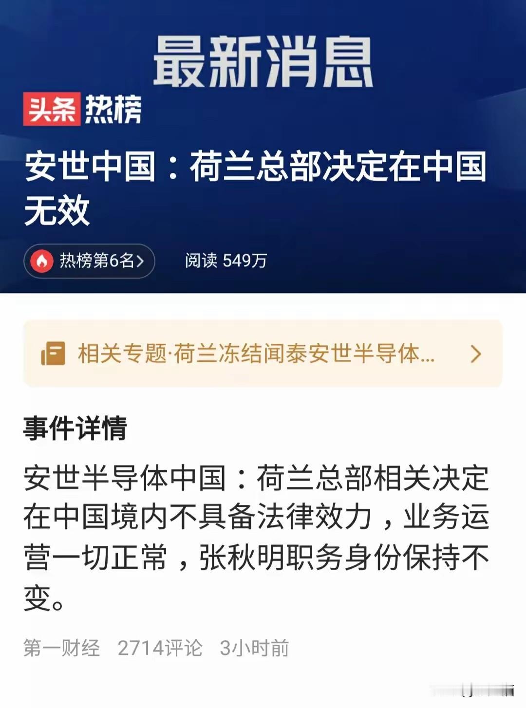 安世中国硬刚荷兰总部:你的决定在中国无效!荷兰亲手砸了自己的信用招牌 安世半导体中国正面硬刚荷兰安世总部:荷兰总部决定在中国无效! 声明说荷兰单方面免去张秋明销售市场部副总裁职务,在中国境内不具法律效力! 荷兰安世半导体被夺控制权这件事,荷兰政府与法院一出手就代表荷兰输了!高管只是棋子,表面工具人!背后是荷兰政府的决定! 荷兰这是亲手损害自己的国际信用、破坏契约精神、挑战国际贸易规则! 一旦信用倒塌,重建就不再容易了! 中国团队这声硬刚,算是戳破了荷兰这场闹剧的底。荷兰总部以为靠一纸免职令就能拿捏中国业务,却忘了中国市场有自己的法律底线——张秋明的职务任免涉及中国境内的经营管理,岂是荷兰那边拍脑袋就能决定的?这种无视属地管辖原则的操作,根本不是商业决策,更像是被政治裹挟后的昏招。 追根溯源,这场控制权之争从一开始就不是企业内部的权力博弈。2019年闻泰科技花334亿买下安世半导体时,明明是一场合规合法的商业并购,荷兰政府当初全程默许,如今却借着地缘政治的由头撕毁契约。去年9月美国修订实体清单规则后,荷兰经济部连夜下部长令冻结安世人事变动,转天荷兰企业法庭就火速裁定暂停闻泰创始人张学政的职权,连500页证据都没给中方充分质证时间,这效率快得不像司法程序,倒像早有预谋的配合。 那些跳出来罢免中国高管的荷兰总部人士,说白了就是被推到前台的工具人。首席法务官联合CFO发起诉讼,看似是管理层反戈,实则背后全靠荷兰政府的"尚方宝剑"撑腰。他们想通过掌控人事权,把安世往"纯荷兰企业"的方向拽,以此讨好美国、规避半导体限制,可他们忘了,安世全球产能里,中国工厂是不可或缺的一环,张秋明这类高管手里攥着的是核心市场资源。 荷兰政府怕是没算清这笔账:自己最看重的国际信用,恰恰毁在了这场刻意干预里。国际贸易最讲"契约精神",荷兰一直标榜自己是商业中立国,结果为了站队美国,说翻脸就翻脸,用行政和司法手段强行改写商业并购的结果。这让全球投资者怎么看?以后谁还敢放心在荷兰做跨境生意?万一哪天地缘风向变了,荷兰政府会不会又故技重施? 更讽刺的是,荷兰想把安世打造成"荷兰资产"的算盘,根本经不起推敲。安世脱胎于飞利浦、恩智浦,中资入主后才从边缘部门做成全球第三大功率半导体企业,2024年营收都冲到147亿了。现在荷兰想摘桃子,却连中国市场的基本规则都不想遵守,连中国高管的任免权都要越界插手,这哪是经营企业,分明是搞政治掠夺。 中国团队的回应其实已经把话说透了:你在荷兰的决定,别想在中国境内生效。张秋明的职务任免说了不算,未来中国工厂的生产、销售谁说了算,更不是荷兰总部能单方面定的。荷兰要是真把中国业务逼急了,受损的只会是安世的全球供应链——毕竟中国市场的份额和产能,可不是短期内能替代的。 信用这东西,建起来要几十年,砸垮了可能只需要一件事。荷兰亲手打破了自己守了多年的商业信誉,等哪天想再吸引中资或者维持国际公信力,恐怕再怎么解释都没用了。毕竟谁也不想和一个随时能撕毁契约、用权力干预商业的伙伴打交道,这才是荷兰这次最亏的地方。
