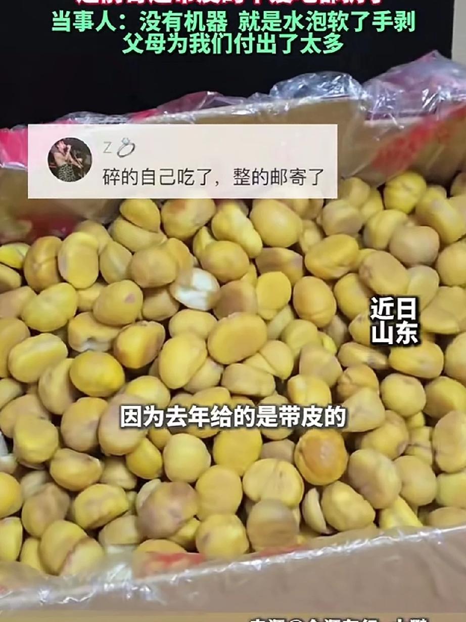 父母手剥生板栗寄给儿子儿媳,一开箱十多斤板栗肉直接让儿媳泪奔! 手剥这十多斤板栗只有父母知道费了多大劲,花了多少工夫,甚至会弄破了手指,把剥碎的自己吃了好的寄给儿子儿媳,这就是为人父母对儿子儿媳满满的爱,就因之前寄过带皮的板栗,儿子一家不愿吃就扔掉了,父母再次寄了剥皮的,感动的儿媳哭的泪流满面,亲生父母未必能做到公婆却做到了,儿媳是个感恩的人吧!不然怎会感动落泪! 愿父母的付出将来会有回报!