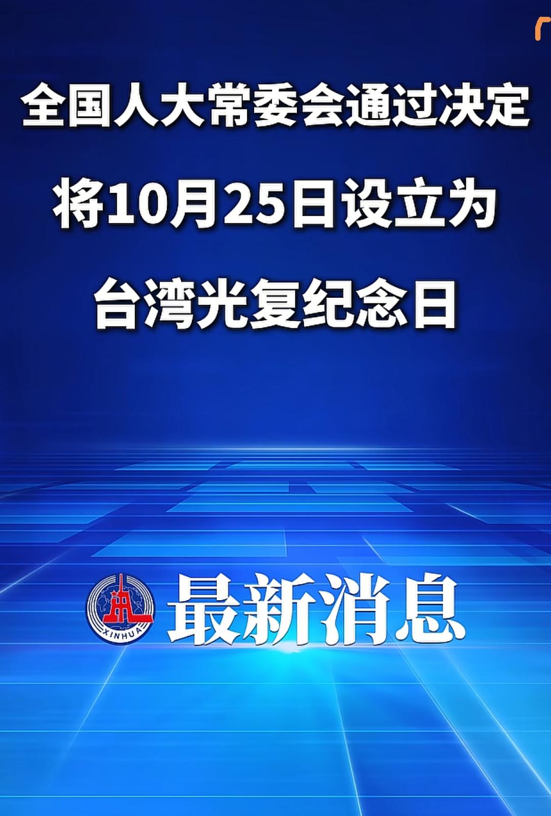 最新消息,全国人大常委会通过决定将10月25日设立为台湾光复纪念日,这标志着完整一家又进了一步,我们什么也不说,什么也不做,又多了一个纪念日,太高兴了,明天又可以过纪念日了,最好女朋友不知道,否则她又要礼物了,开句玩笑。为祖国繁荣昌盛,越来越强大,鼓掌,加油、加油、加油!!