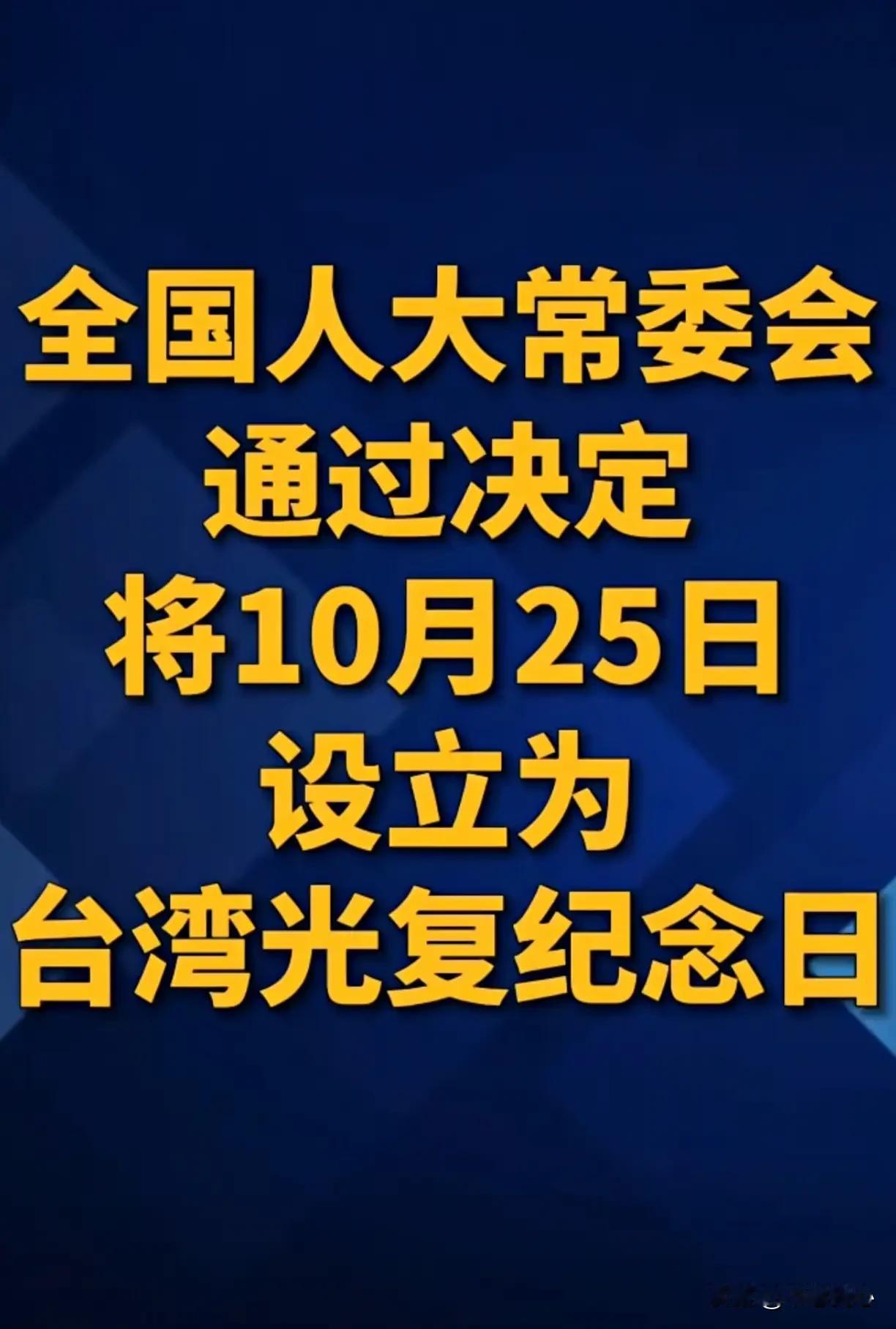 两岸同文同种,现在,全国人大常委会通过决定,设立了台湾光复纪念日,和台湾省的台湾光复节,就是同一个意思。无论是光复纪念日,还是光复节,都是每年10月25日庆祝,纪念台湾脱离日本殖民统治的节日。明天,两岸人民将共同庆贺、共同纪念。且看赖清德之流再怎么狡辩! 二十届四中全会公报里提到,“推进祖国统一大业”!为了这项伟大的事业,几十年前,吴石、朱枫、陈宝仓、聂曦等一批仁人志士付出了生命的代价,先烈们的光荣事迹,必将激励两岸同胞为早日完成祖国统一大业、实现民族伟大复兴而不懈奋斗。 台湾,归来兮!让荣耀不再沉默!