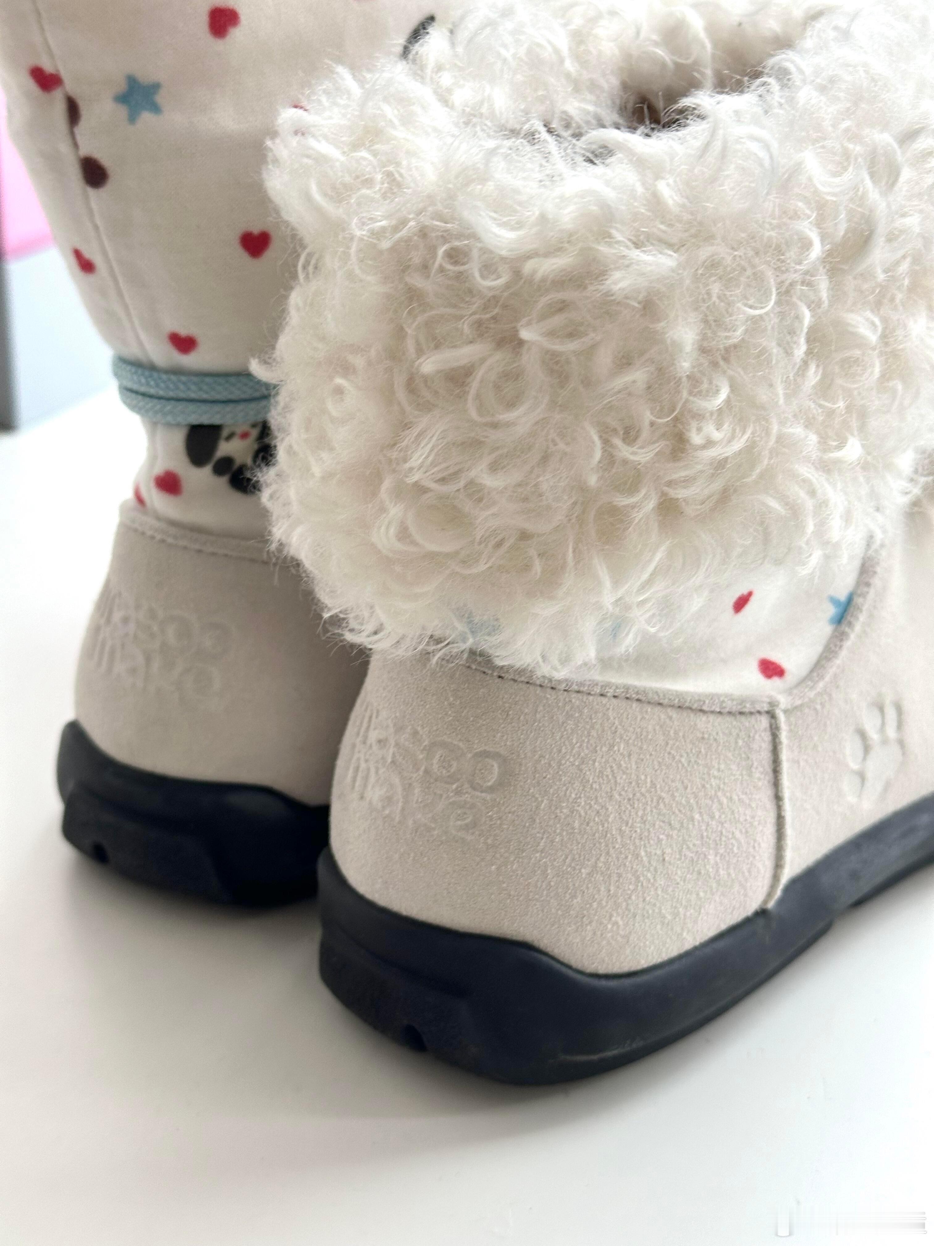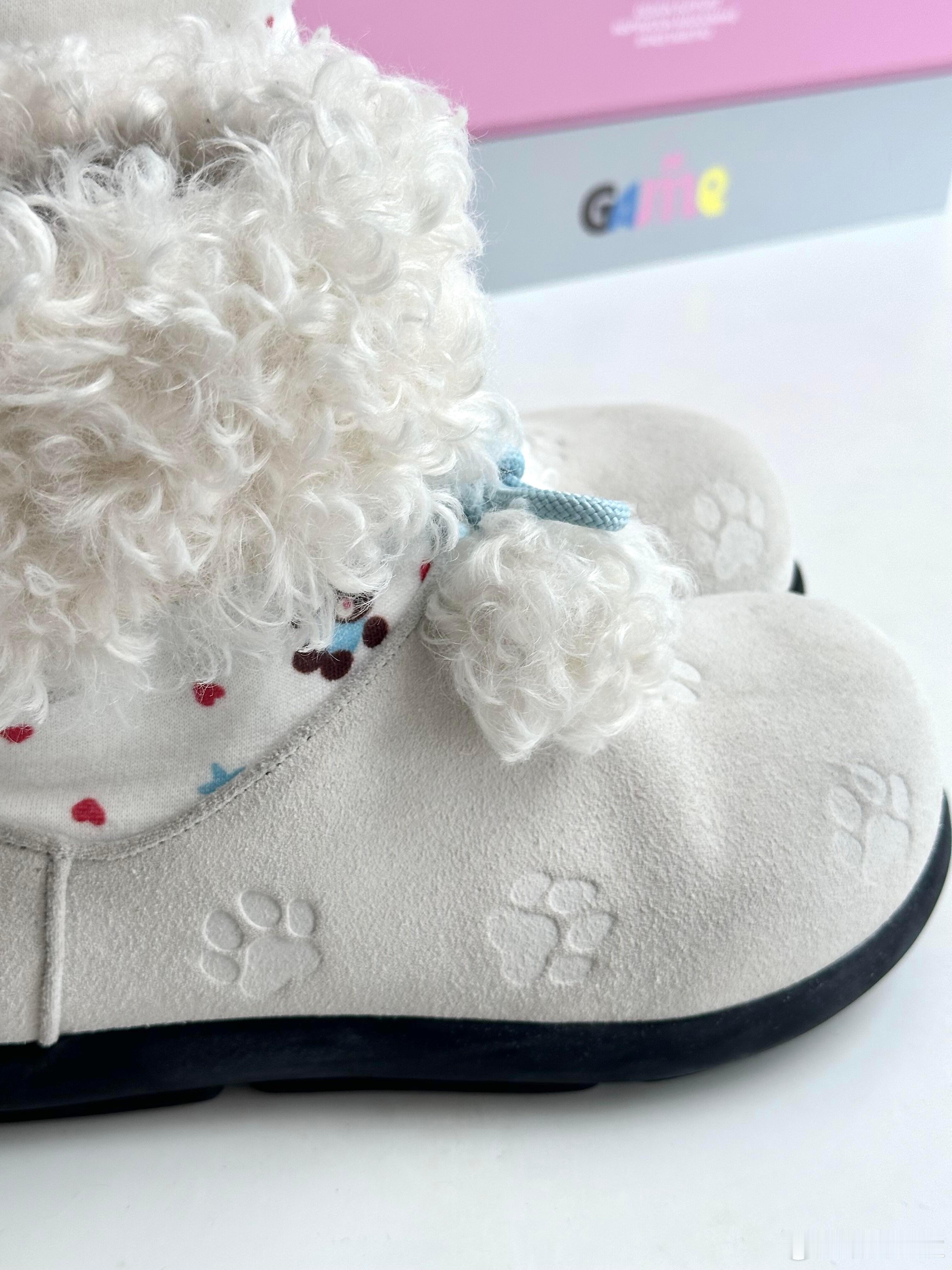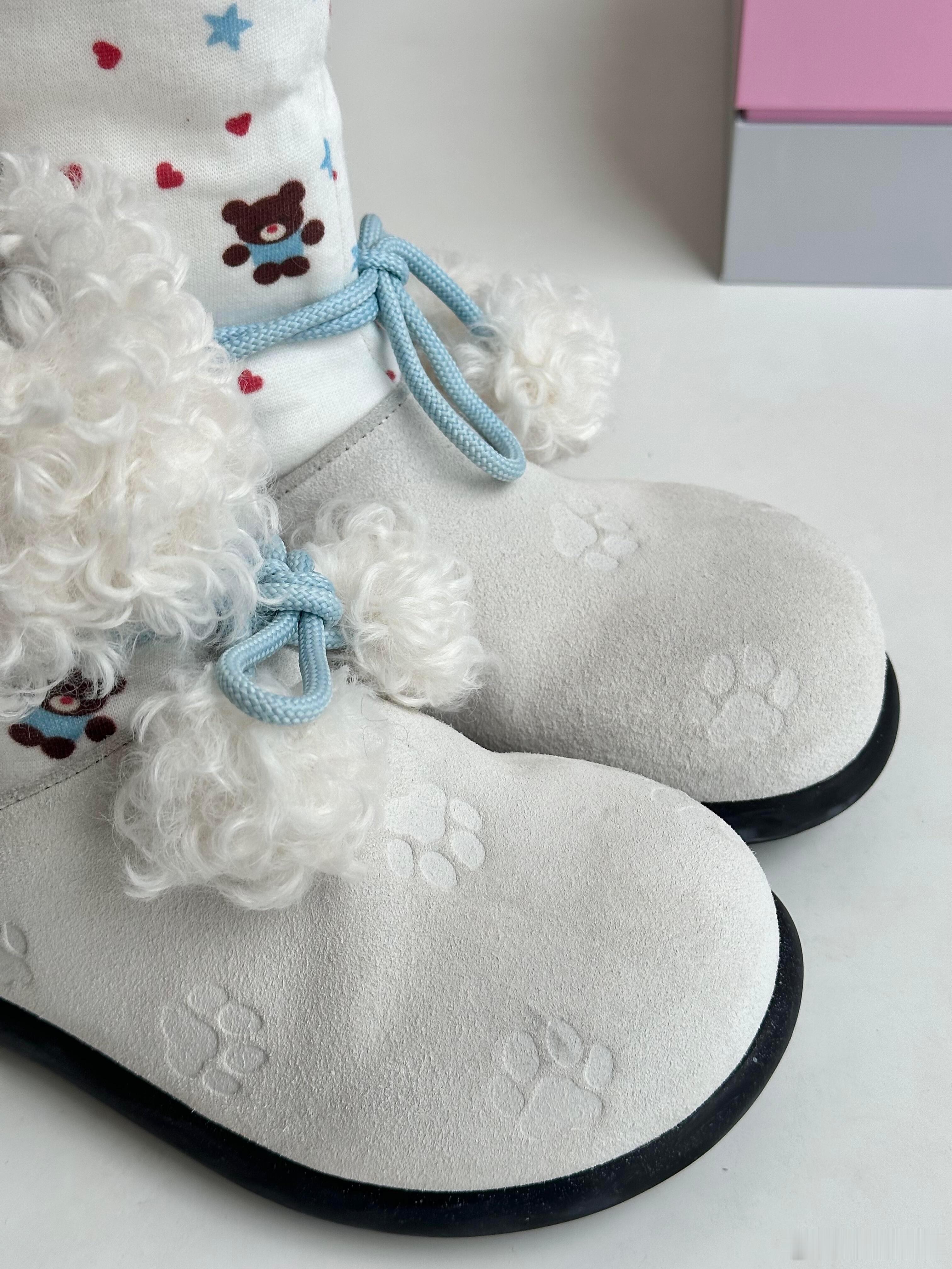 这双白色短靴以蓬松卷曲的毛绒鞋口为标志性设计,搭配浅蓝色鞋带系成的俏皮毛球,尽显冬日温暖与灵动。鞋面采用柔软绒面材质,压印着多处浅色立体爪印图案,充满童趣巧思。鞋帮处点缀卡通小狗与红蓝星心印花,细节丰富活泼。黑色耐磨橡胶鞋底为纯白鞋身增添实用性与色彩对比。整体设计完美融合雪地靴的保暖功能与可爱美学,无论是毛绒质感还是爪印元素,都展现出甜美温馨的冬日氛围,适合追求个性与趣味的时尚爱好者。时尚鞋履
