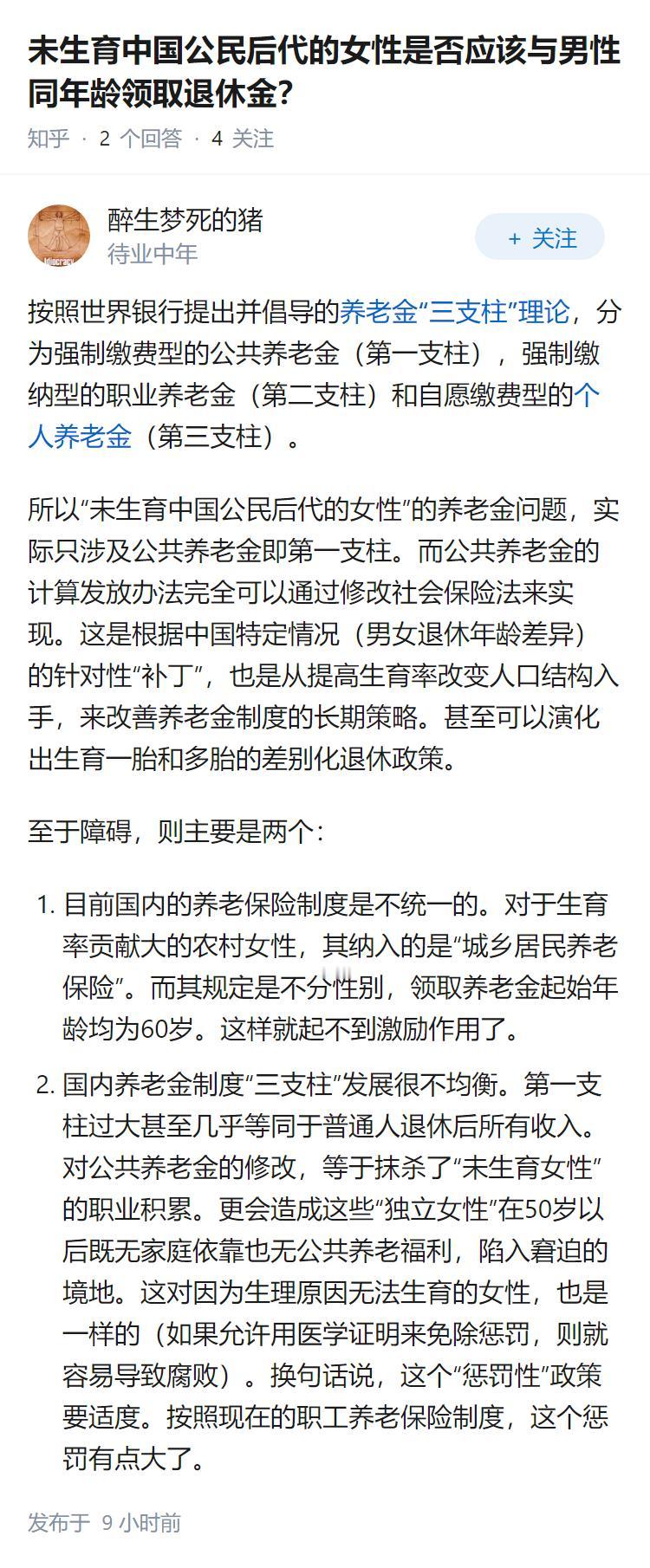 未生育中国公民后代的女性是否应该与男性同年龄领取退休金?