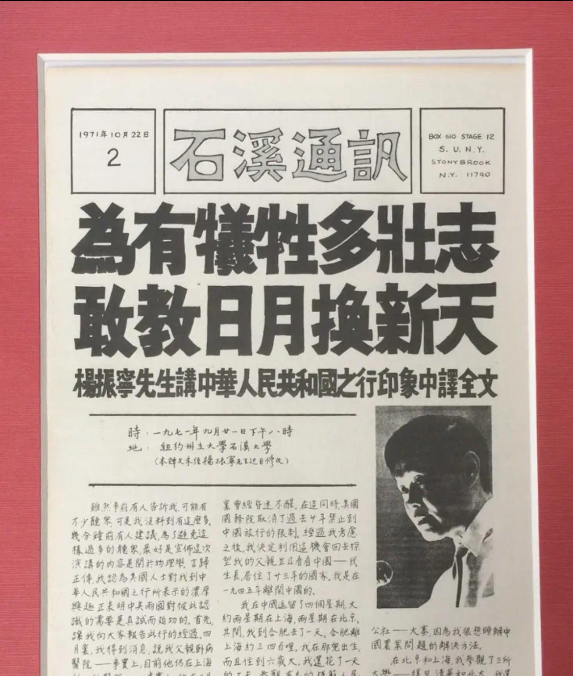 1971年夏天,诺贝尔物理学奖得主杨振宁教授在中美关系解冻前夜,毅然访问新中国,见识了新中国发展的可喜成绩。 而当时西方世界对中国的报道充斥着歪曲和偏见。杨振宁回国后开始各个场合演讲,以世界顶级科学家的身份和信誉,向美国公众、特别是华人社群和知识界,提供了关于中国的第一手、相对客观的信息。他讲述了中国在科技、教育、社会建设等方面取得的成就,打破了西方媒体的垄断叙事。