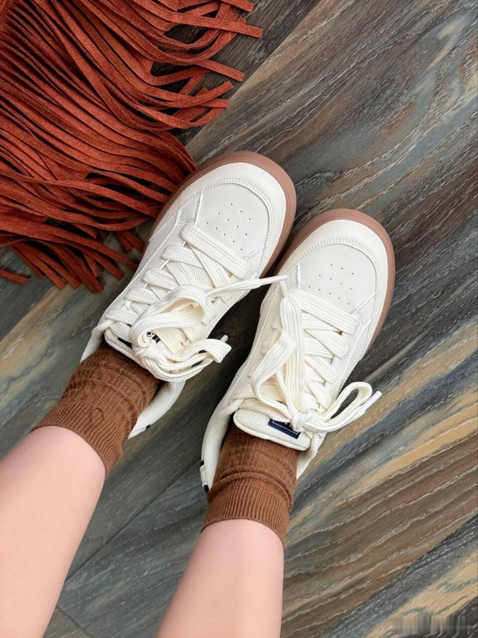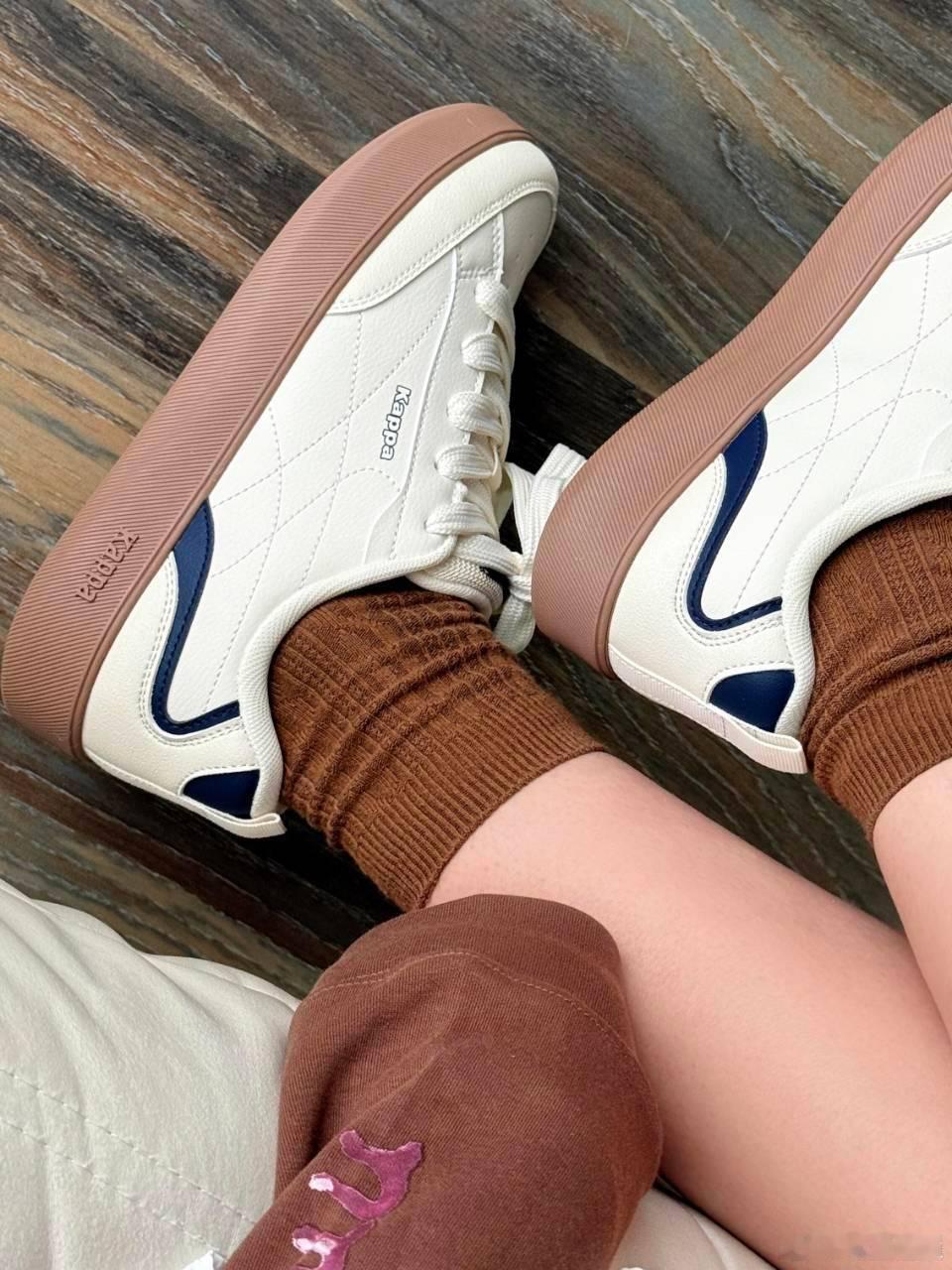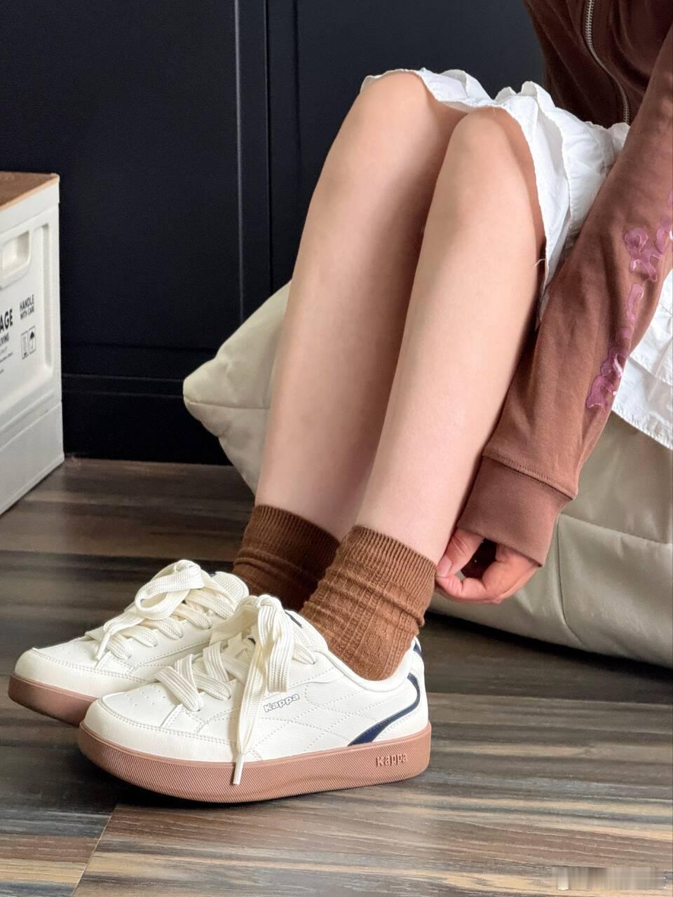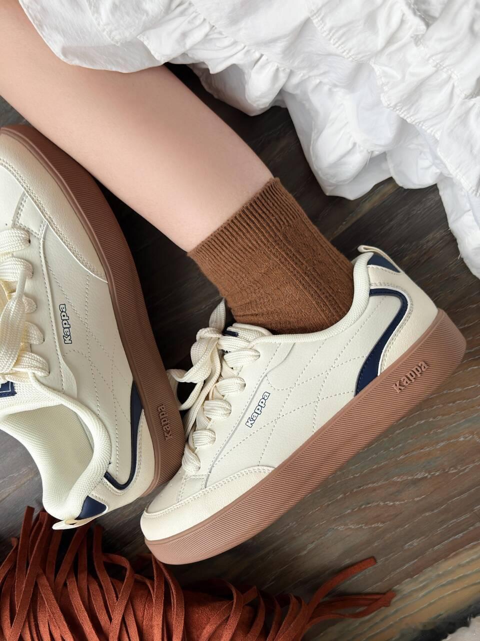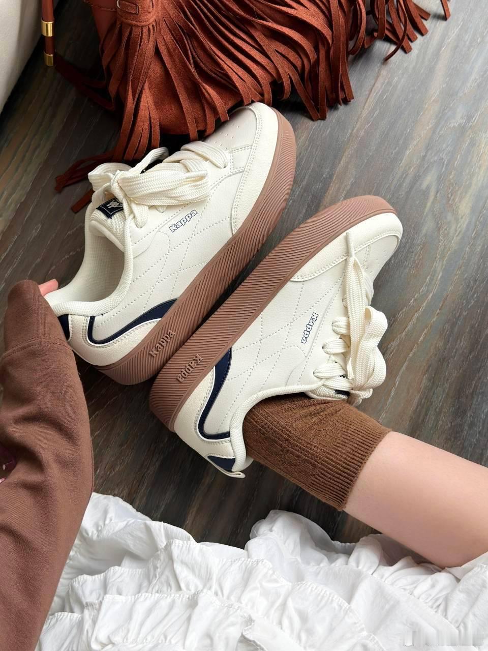 这双Kappa运动鞋以米白色为主调,鞋面采用菱形格纹设计,搭配深蓝色侧边线条,简约中不失细节巧思。棕褐色橡胶鞋底与整体暖色调呼应,鞋舌与后跟清晰印有品牌标识。搭配的棕色针织袜为造型注入秋冬暖意,木质地板与流苏配饰更烘托出休闲氛围。鞋子融合了复古运动基因与现代日常审美,无论是出街或休闲场合都能轻松驾驭,完美诠释了舒适与时尚兼备的意式风格。时尚鞋履时尚奢品