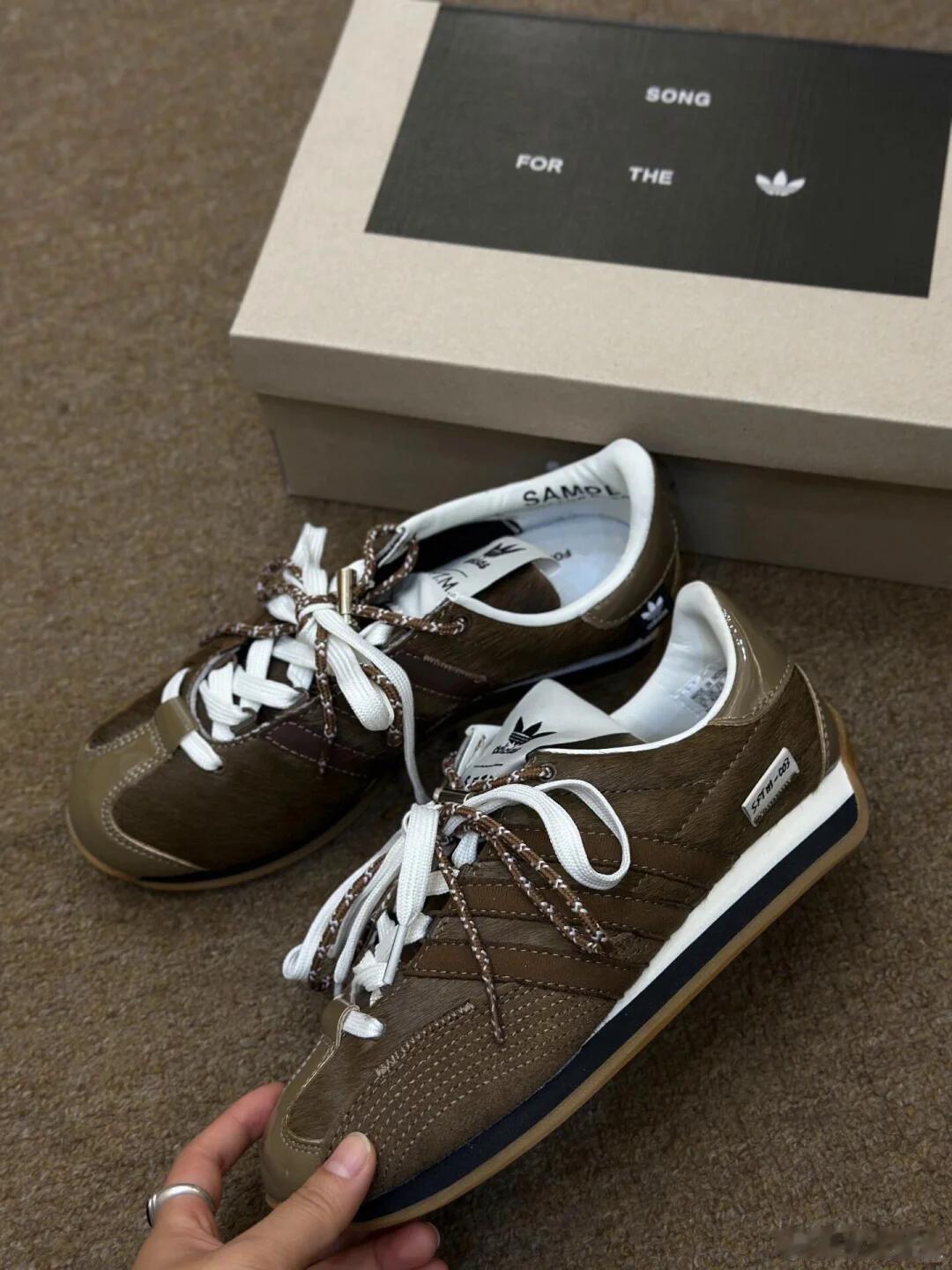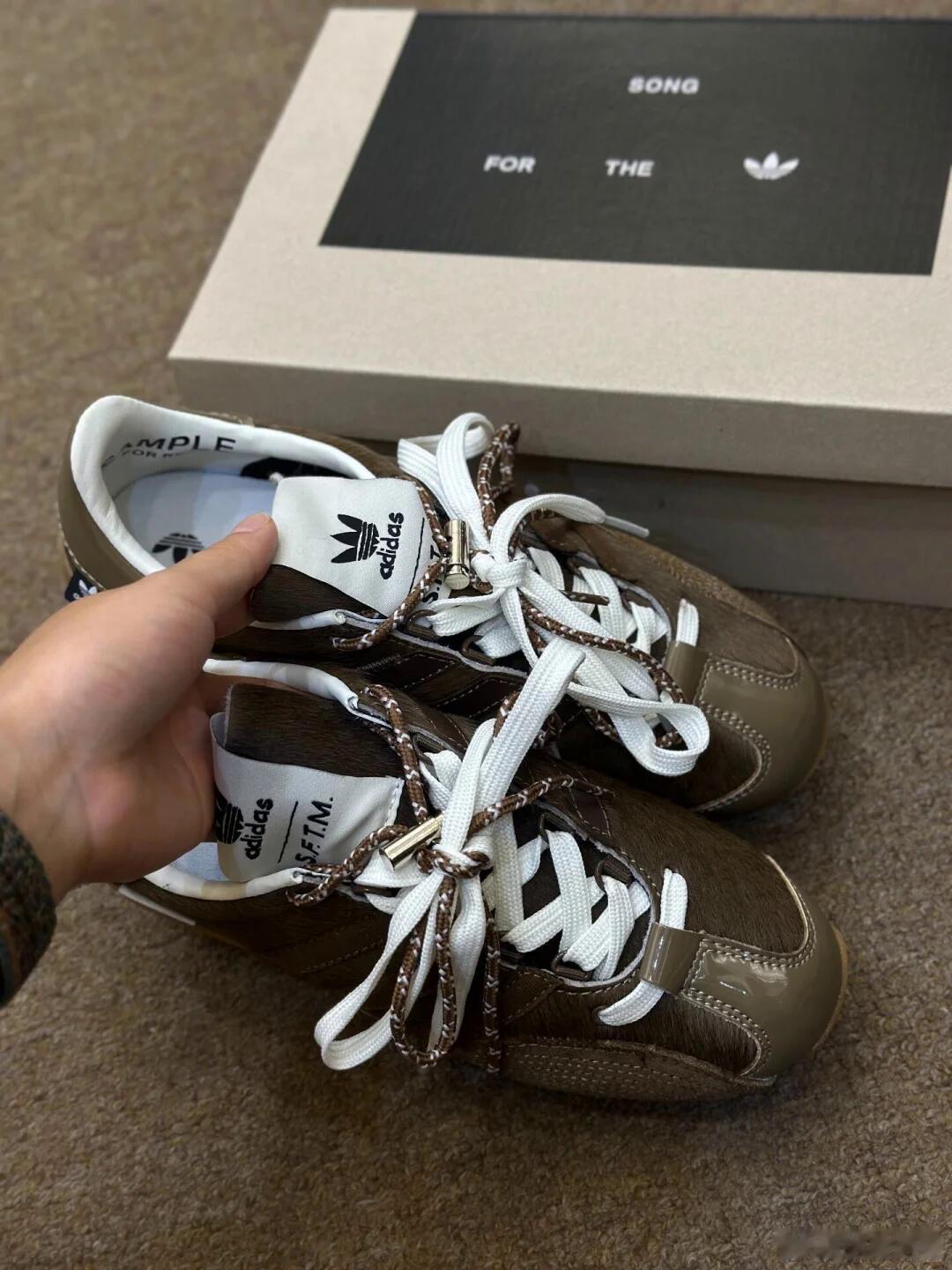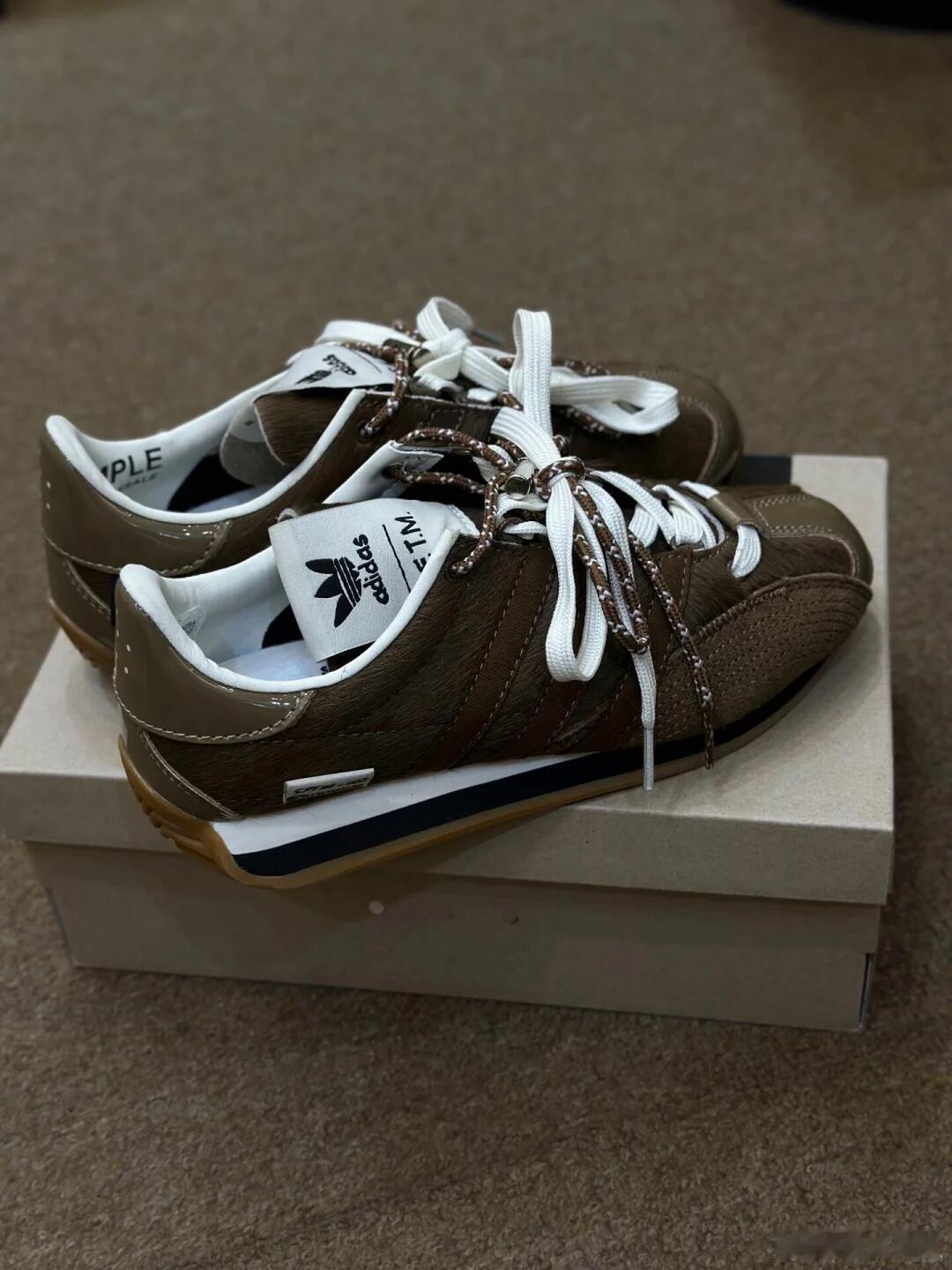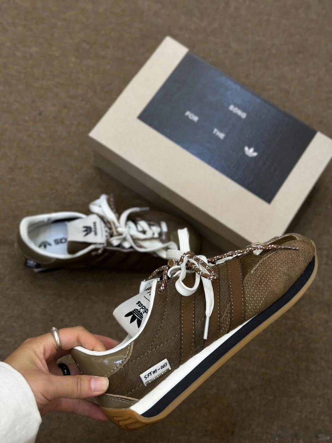 这双阿迪达斯运动鞋以深棕色麂皮鞋面尽显复古质感,标志性的白色三条纹与侧身三叶草Logo形成经典视觉符号。白色鞋带上的细微闪光颗粒成为点睛之笔,鞋垫处若隐若现的“SIMPLE”字样呼应其简约设计哲学。鞋身轮廓流畅,搭载舒适缓震鞋底,兼具经典造型与现代穿着体验。整体置于纯白鞋盒与浅棕地板的柔和背景中,沉稳色调烘托出怀旧时尚氛围。无论是日常休闲或潮流搭配,都能轻松驾驭,完美诠释了复古运动美学的永恒魅力。时尚鞋履时尚奢品