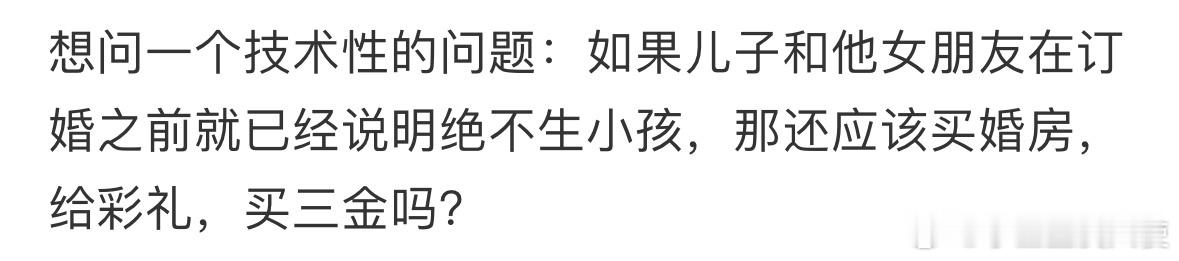 如果儿子和他女朋友在订婚之前就已经说明绝不生小孩,那还应该买婚房,给彩礼,买三金吗❓