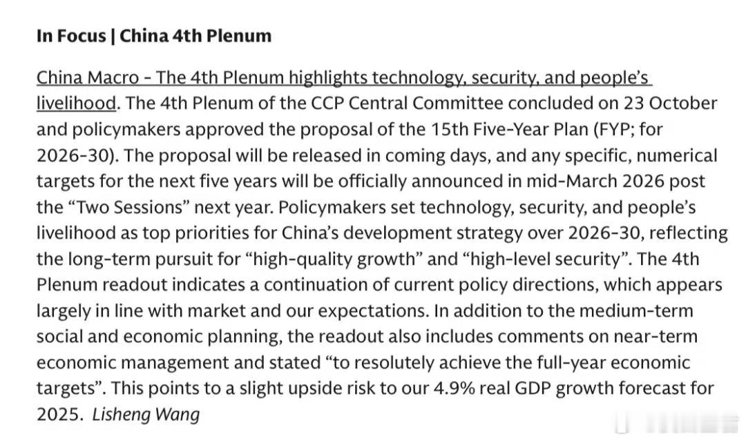 劲爆的是高盛指出中国明确以科技、安全和民生为未来五年发展主轴,释放“high-quality growth”(高质量增长)与“high-level security”(高级别安全)强烈信号,暗示2025年GDP增速有望超越此前预测的4.9%。