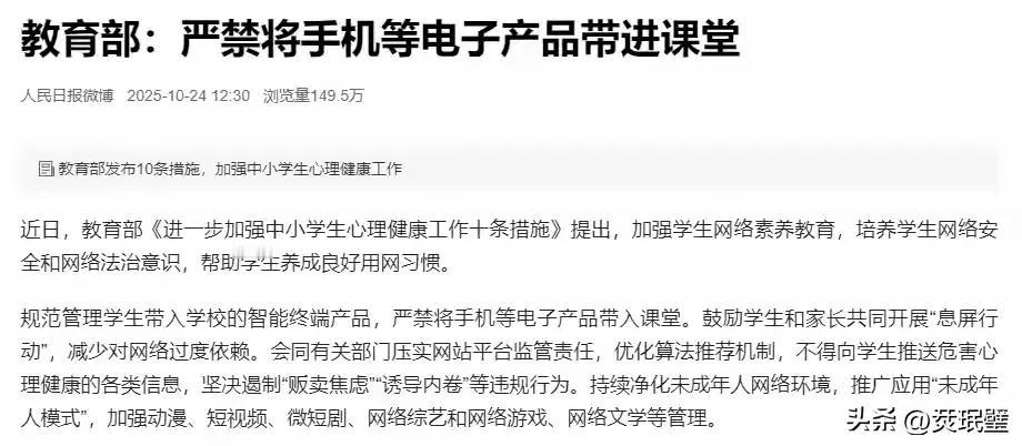 重磅!教育部刚刚官宣:严禁手机等电子产品带入课堂!全国中小学集体“断网”,家长圈彻底炸锅! 10月24日,教育部发布《进一步加强中小学生心理健康工作十条措施》,明确要求:严禁手机等电子产品进入课堂!违规者,手机将被统一收缴保管,放学后方可取回。一时间,家长群炸了:电话手表能带吗?老师上课能用手机吗? 现实太扎心!有老师曝光:一名初二学生用电话手表搜题抄答案,作业全对,成绩“突飞猛进”,结果一考试原形毕露!更有人夜间刷视频、打游戏,白天上课打盹,焦虑、抑郁风险飙升! 政策不是“一刀切”!确需带手机的,须家长申请,入校即交由学校保管。学校将设公共电话、电子学生证,保障紧急联络。 这波操作,直击“低头族”痛点!北京某校试点“手机入袋”后,课堂抬头率提升40%,学生睡眠平均多出1小时。挪威禁手机后,学生成绩集体上涨! 是保护,还是限制?是夺回专注力,还是切断科技连接?这场“断网行动”,正在重塑孩子的成长环境。你怎么看?