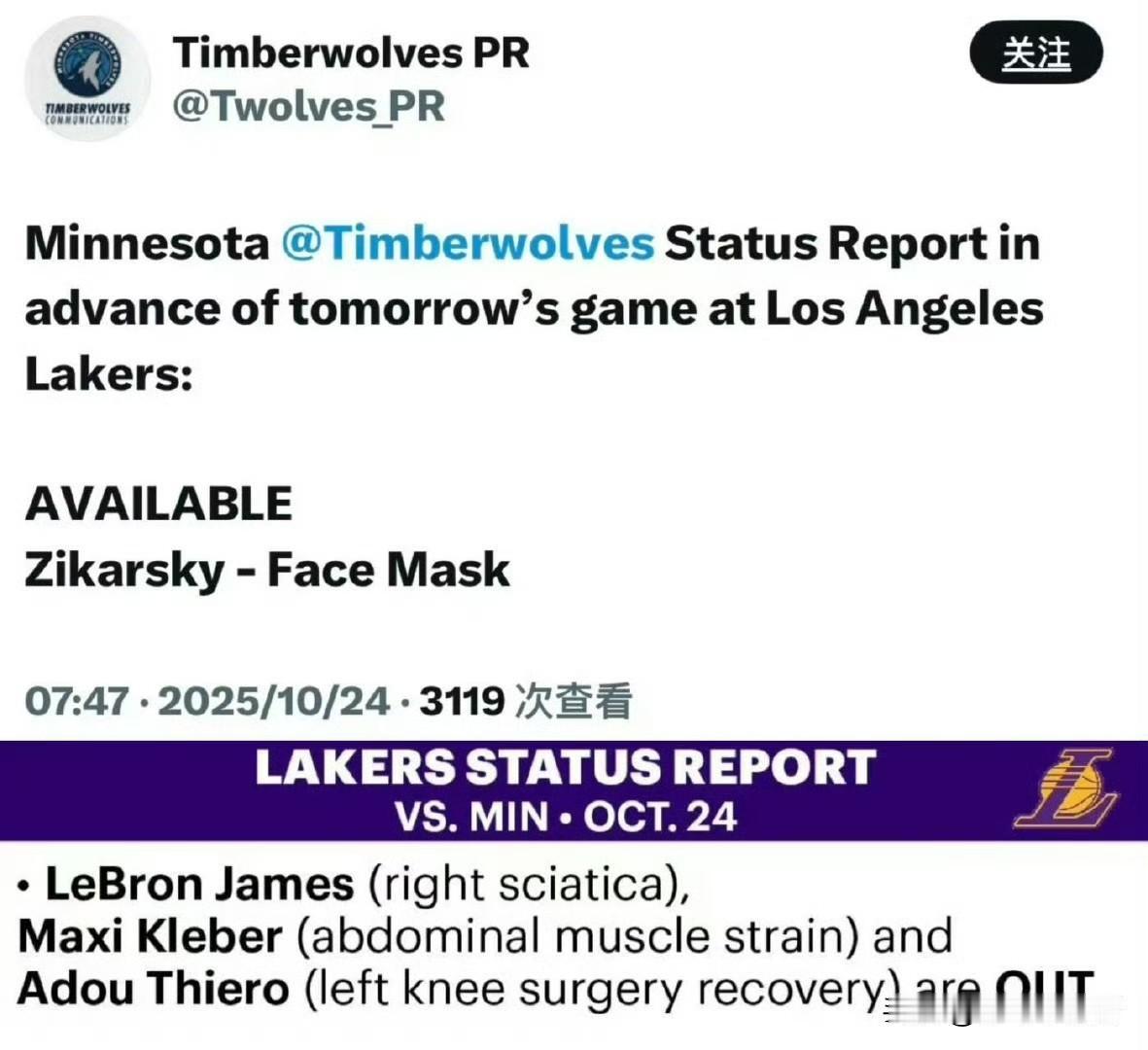 新赛季首胜???湖人迎战森林狼,主场作战被看好! 北京时间10月25日,今天周六,又是一个大的比赛日,球迷们可以好好看一天的比赛了,湖人今天迎来新赛季第二场比赛,也是主场作战,比赛在上午10点,对手是森林狼,湖人能否获得新赛季首胜呢? 从ESPN给出的伤病报告和胜率来看,森林狼全员出战,湖人还是那几个伤病,而湖人和森林狼拿下这场比赛的胜率几乎相同,湖人略高一点点,看来ESPN认为双方实力相当。 比赛最大的看点还是爱德华兹和东契奇之间的对决,以及艾顿面对最佳防守戈贝尔会有怎样的表现呢,要知道森林狼可是湖人的仇人,上个赛季季后赛就是森林狼送走湖人的,仇人相见分外眼红啊。 不过这场比赛还是不太容易的,湖人想拿下森林狼可不是仅靠预测能赢就可以做到的,他们还是赛程还是很艰难的。湖人 东契奇 爱德华兹