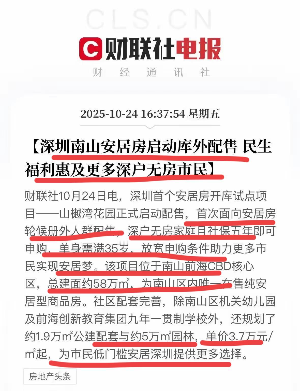 好消息!深圳无房市民有福了! 南山安居房首次向库外配售,民生福利惠及众多无房深圳市民~ 什么意思呢?以前你想买安居房,必须符合条件申请入库,然后就是排队轮候等待有符合你的房源,排到队后可以选房! 现在,好政策来了,只要你是深户,社保满五年,就可以无需申请,无需轮候,直接买房了,这可是南山前海CBD核心区,价格也是相当优惠,比市场价腰斩还便宜,只要3.7万元一平米!你要知道,南山寸土寸金,价格基本10万以上,这价格等于直接打骨折了~太好了,有钱无房的深圳市民,赶紧的,3.7万一平的南山CBD核心区安居房,你值得拥有!! 这价格,