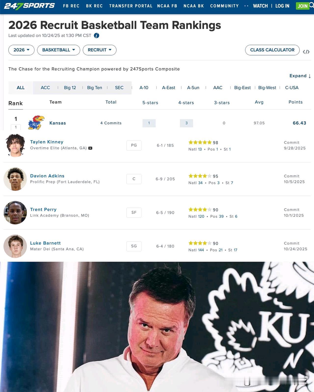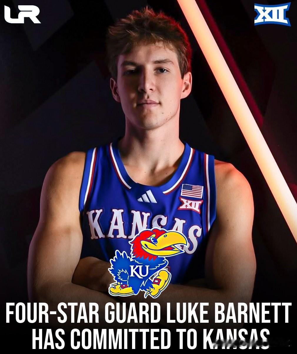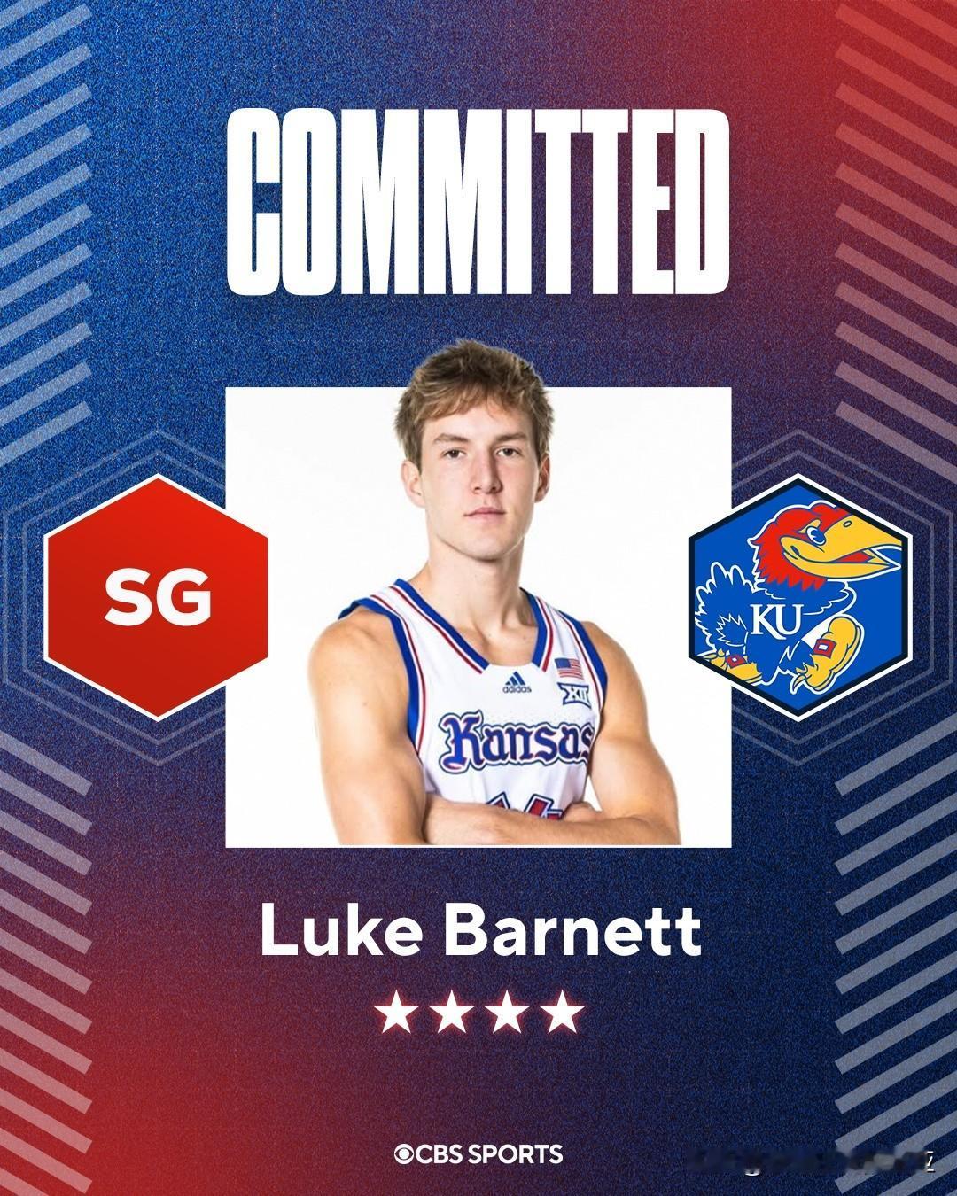 四星分卫Luke Barnett宣布承诺NCAA男篮 堪萨斯大学,身高6-3=191,高中就读于加州Mater Dei,塞尔夫教练认为他能够拉开空间、命中投篮并且打球时始终充满活力,球队这届收到的第四位加盟者,之前还有Taylen Kinney,Davion Adkins与Trent Perry。