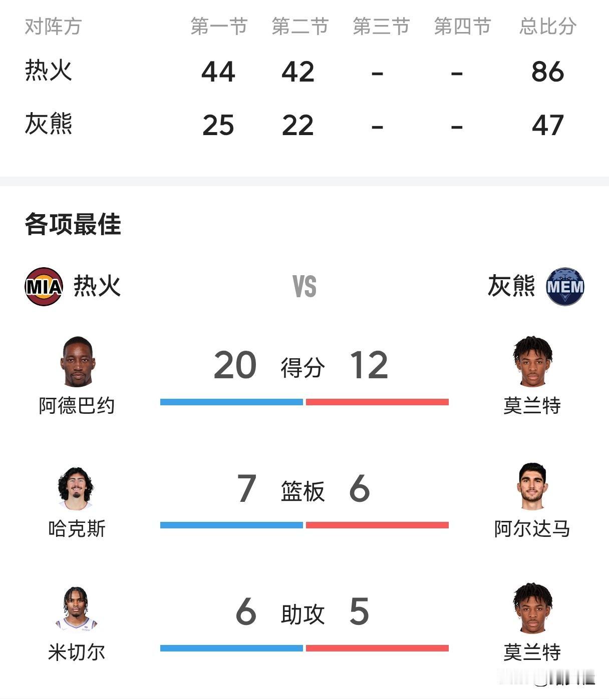 势不可挡!常规赛打成全明星,热火半场狂轰86分 今天热火在客场挑战灰熊。半场结束,热火以86-47领先。 本场比赛,热火队火力全开。全队两分球36中20,三分球16中10。全队4人得分上双,其中阿德巴约得到20分,鲍威尔12分,威金斯和威尔各10分。 半场86分创NBA常规赛新记录。