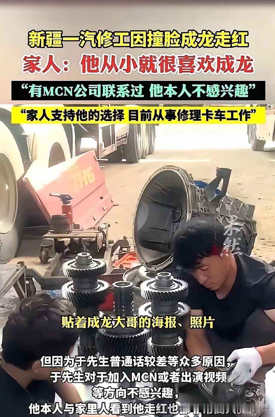 新疆一汽修工,因为与成龙长得太像,成了追星现场! 顾客来修车,看到他,都喊“龙叔”,他无奈了:“我哪是龙叔,我只是普通修车工,脸撞对了。”本来来这家汽修店修车的顾客不多,现在来修车的顾客,都要和他合个影。甚至,附近那家洗车店,也跟着火了! 说起来也好笑,这不禁让我想起了,重庆有个外卖小哥,因为与周杰伦同样的发型、同样的身材,撞脸了,客人看到他,都说:“你就是杰伦吧!”还有东北菜市场大姐,因为与那英也很像,逢人都说:“我哪是那英,我不过是一个卖菜的大姐。”真是接地气版的明星体验卡啊!