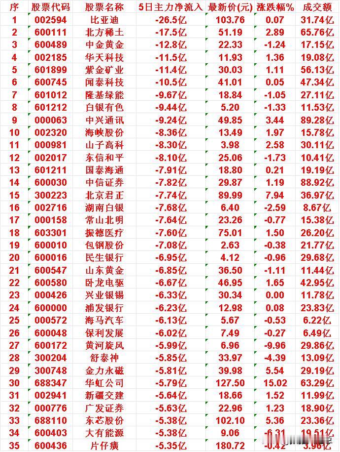 本周,整个市场“主力资金净流出的”35个股汇总 比亚迪:5日主力净流入 -26.5亿元,涨跌幅 +0.07%,成交额 31.74亿元 北方稀土:5日主力净流入 -17.5亿元,涨跌幅 +2.89%,成交额 65.76亿元 中金黄金:5日主力净流入 -12.8亿元,涨跌幅 -1.24%,成交额 17.15亿元 华天科技:5日主力净流入 -11.5亿元,涨跌幅 +1.36%,成交额 19.08亿元 紫金矿业:5日主力净流入 -11.4亿元,涨跌幅 +1.11%,成交额 56.13亿元 闻泰科技:5日主力净流入 -10.5亿元,涨跌幅 +0.05%,成交额 47.34亿元 隆基绿能:5日主力净流入 -9.67亿元,涨跌幅 -1.05%,成交额 27.11亿元