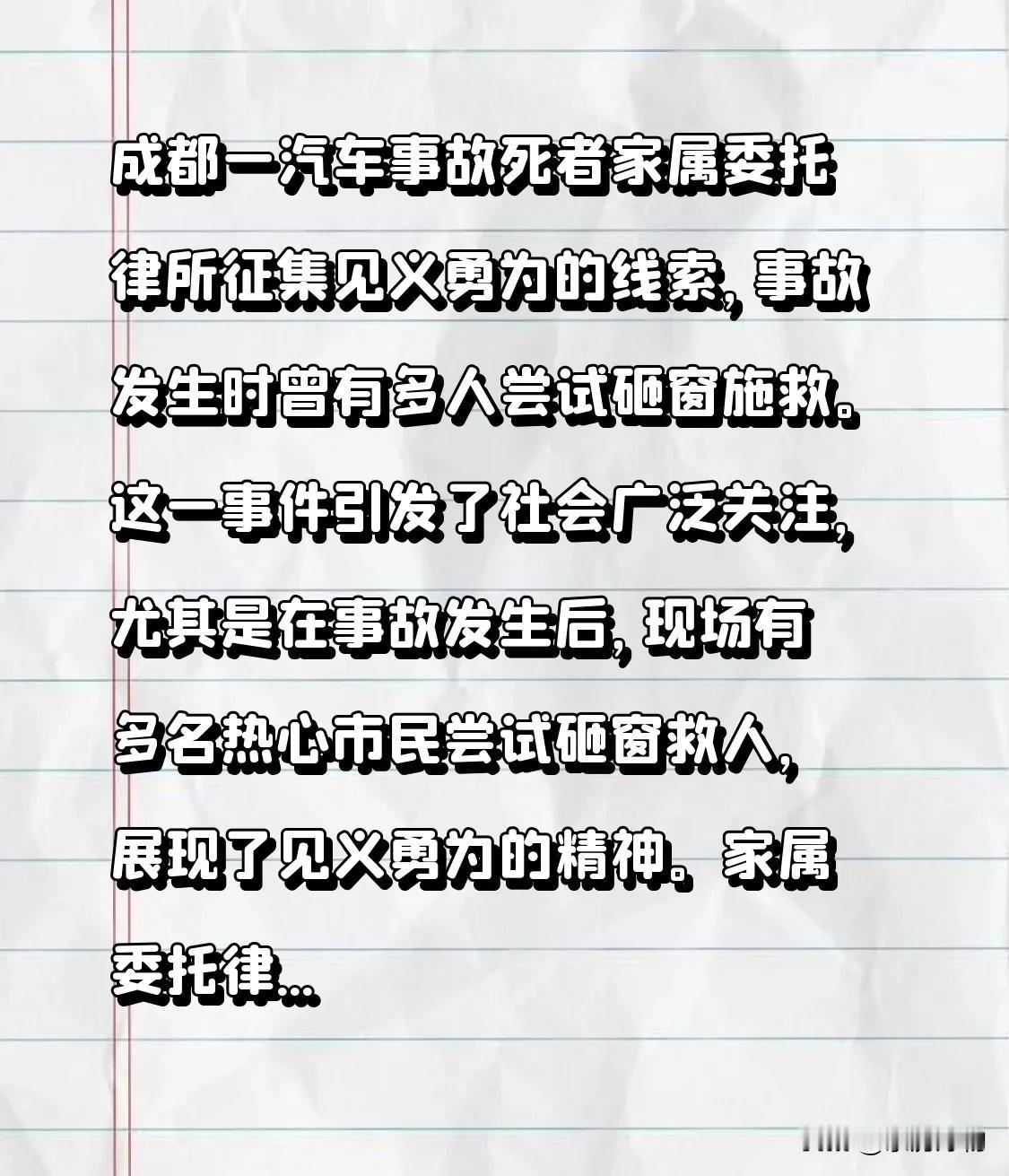 成都一汽车事故死者家属委托律所征集见义勇为的线索,事故发生时曾有多人尝试砸窗施救。这一事件引发了社会广泛关注,尤其是在事故发生后,现场有多名热心市民尝试砸窗救人,展现了见义勇为的精神。 家属委托律所征集线索,可能是为了寻找更多目击者或参与者,以便还原事故真相,并表彰那些在危急时刻伸出援手的热心市民。这种行为不仅有助于推动社会正能量的传播,也可能为未来的类似事件提供借鉴。 目前,事故的具体原因和责任认定仍在调查中,相关部门也在积极处理此事。希望社会各界能够继续关注,并为见义勇为的行为点赞,同时也提醒大家在日常生活中注意安全,避免类似悲剧的发生。 如果你有任何相关线索或信息,可以通过律所提供的渠道进行反馈,帮助家属和相关部门更好地处理此事故。